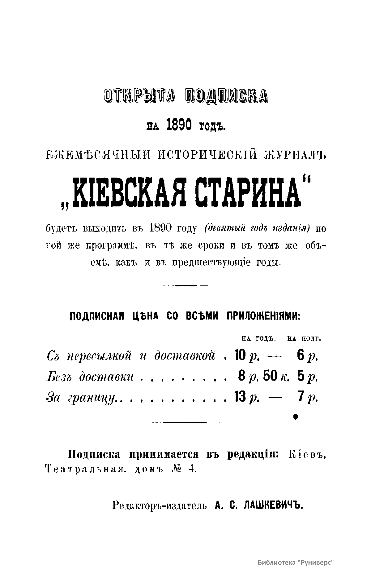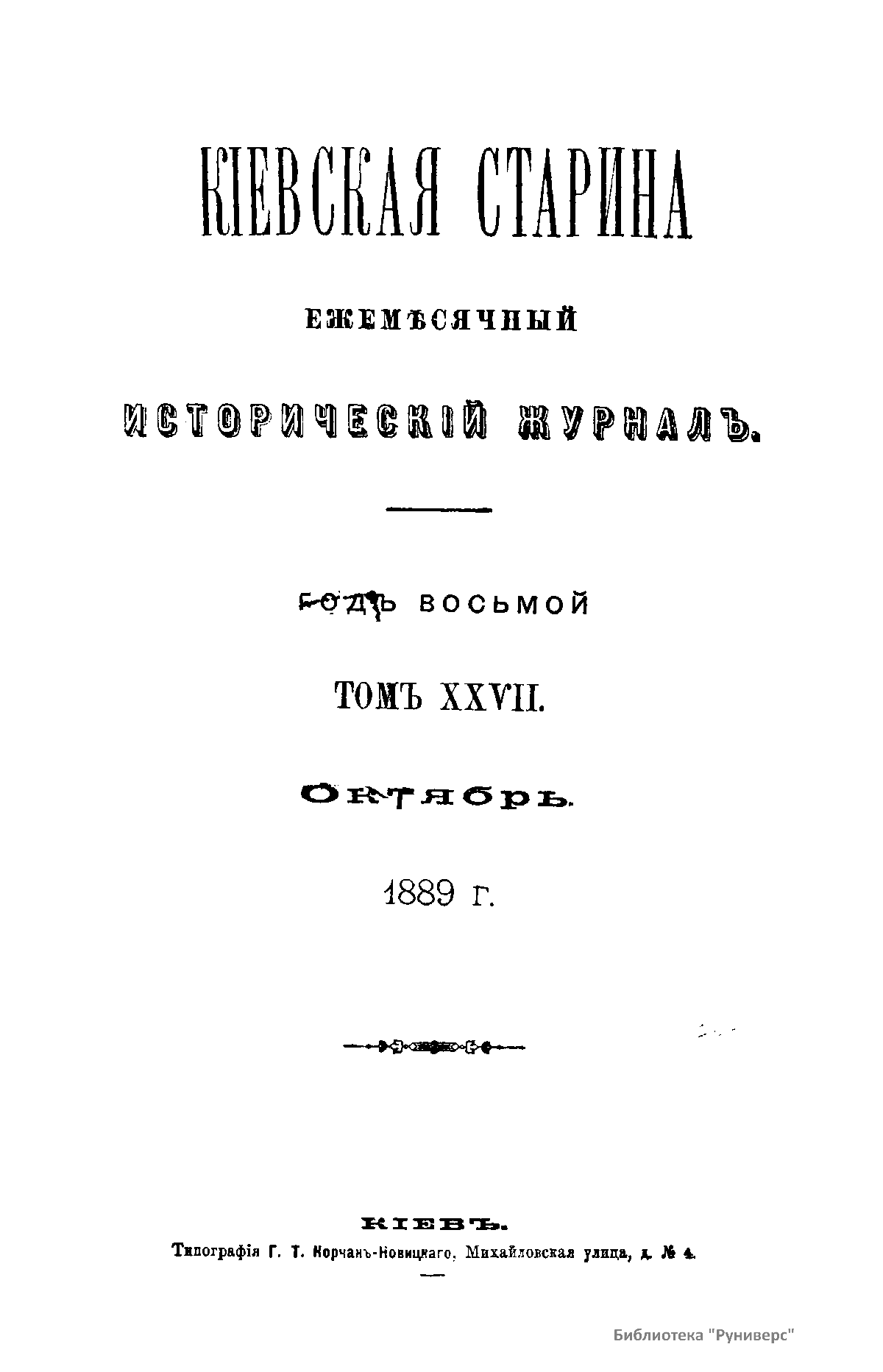 Киевская старина. Год восьмой. Том XXVII. Октябрь-Декабрь 1889 г.