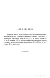Военно-историческая комиссия Генерального штаба представляет сборник материалов по русско-турецкой войне 1877 – 1878 гг. на Балканском полуострове в 97 выпусках. Издание формирует полное представление о военных действиях и участниках этой войны. Русско-турецкая война 1877 – 1878 гг. была вызвана нежеланием Турции принять меры к улучшению положения подвластных ей христианских княжеств, обусловленному парижским трактатом 1856 г, и стремлением России укрепить свое влияние на Балканах. Способствовала освобождению народов Балканского полуострова от османского владычества. Россия объявила войну Турции 12 апреля 1877 г. Основные события: 1877 – сражение на Шипке, осада и взятие русскими войсками Плевны и Карса; 1878 – зимний переход русской армии через Балканский хребет, победы у Шипки – Шейново, Филиппополя, взятие Адрианополя. Завершилась Сан-Стефанским миром 1878 г., который обеспечил независимость балканским народам и территориальные приобретения России. Но Берлинский трактат ограничил независимость Болгарии и влияние России на Балканах.