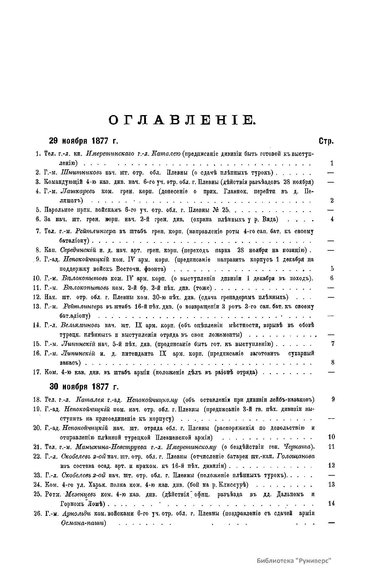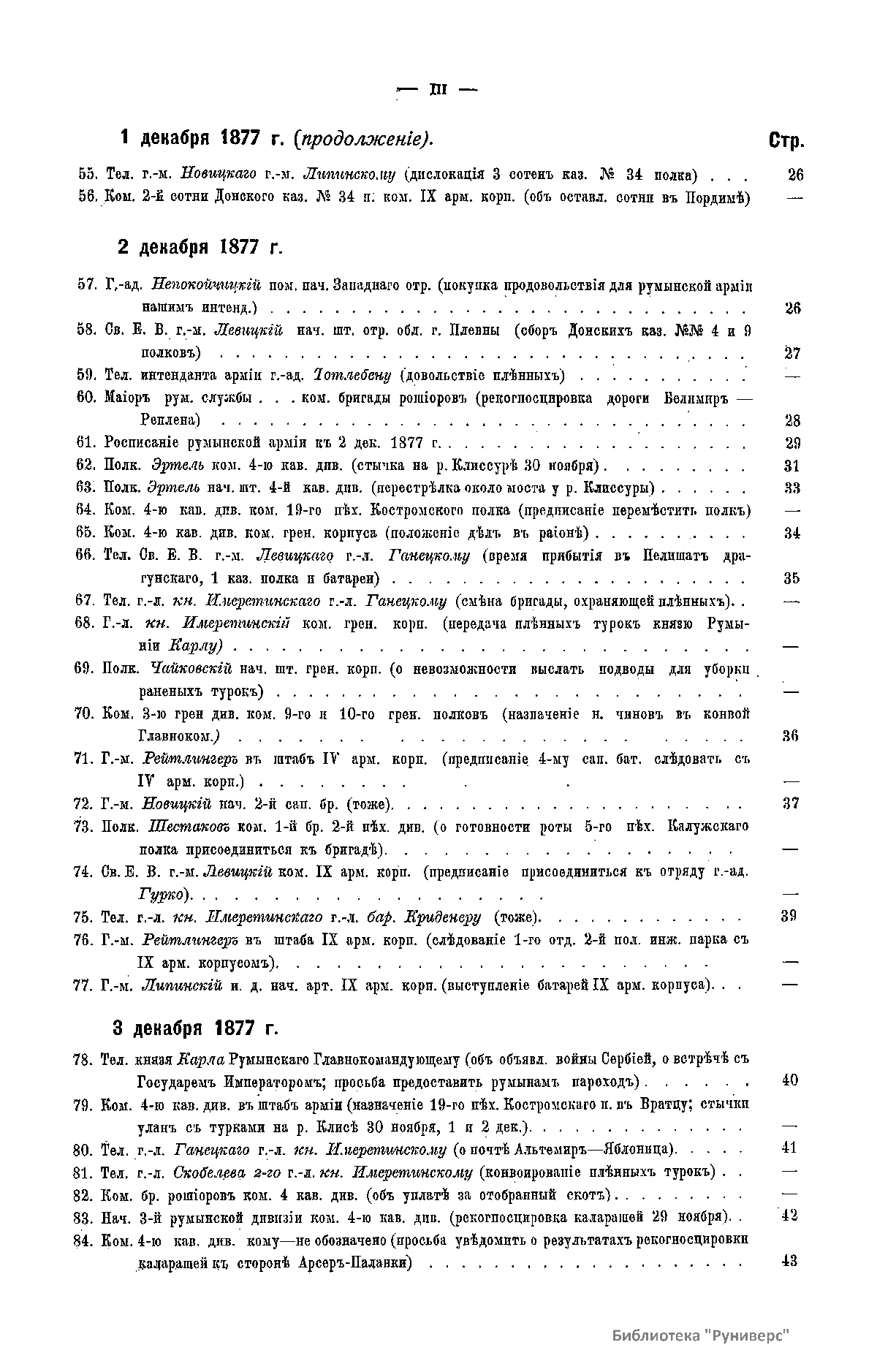 Военно-историческая комиссия Генерального штаба представляет сборник материалов по русско-турецкой войне 1877 – 1878 гг. на Балканском полуострове в 97 выпусках. Издание формирует полное представление о военных действиях и участниках этой войны. Русско-турецкая война 1877 – 1878 гг. была вызвана нежеланием Турции принять меры к улучшению положения подвластных ей христианских княжеств, обусловленному парижским трактатом 1856 г, и стремлением России укрепить свое влияние на Балканах. Способствовала освобождению народов Балканского полуострова от османского владычества. Россия объявила войну Турции 12 апреля 1877 г. Основные события: 1877 – сражение на Шипке, осада и взятие русскими войсками Плевны и Карса; 1878 – зимний переход русской армии через Балканский хребет, победы у Шипки – Шейново, Филиппополя, взятие Адрианополя. Завершилась Сан-Стефанским миром 1878 г., который обеспечил независимость балканским народам и территориальные приобретения России. Но Берлинский трактат ограничил независимость Болгарии и влияние России на Балканах.