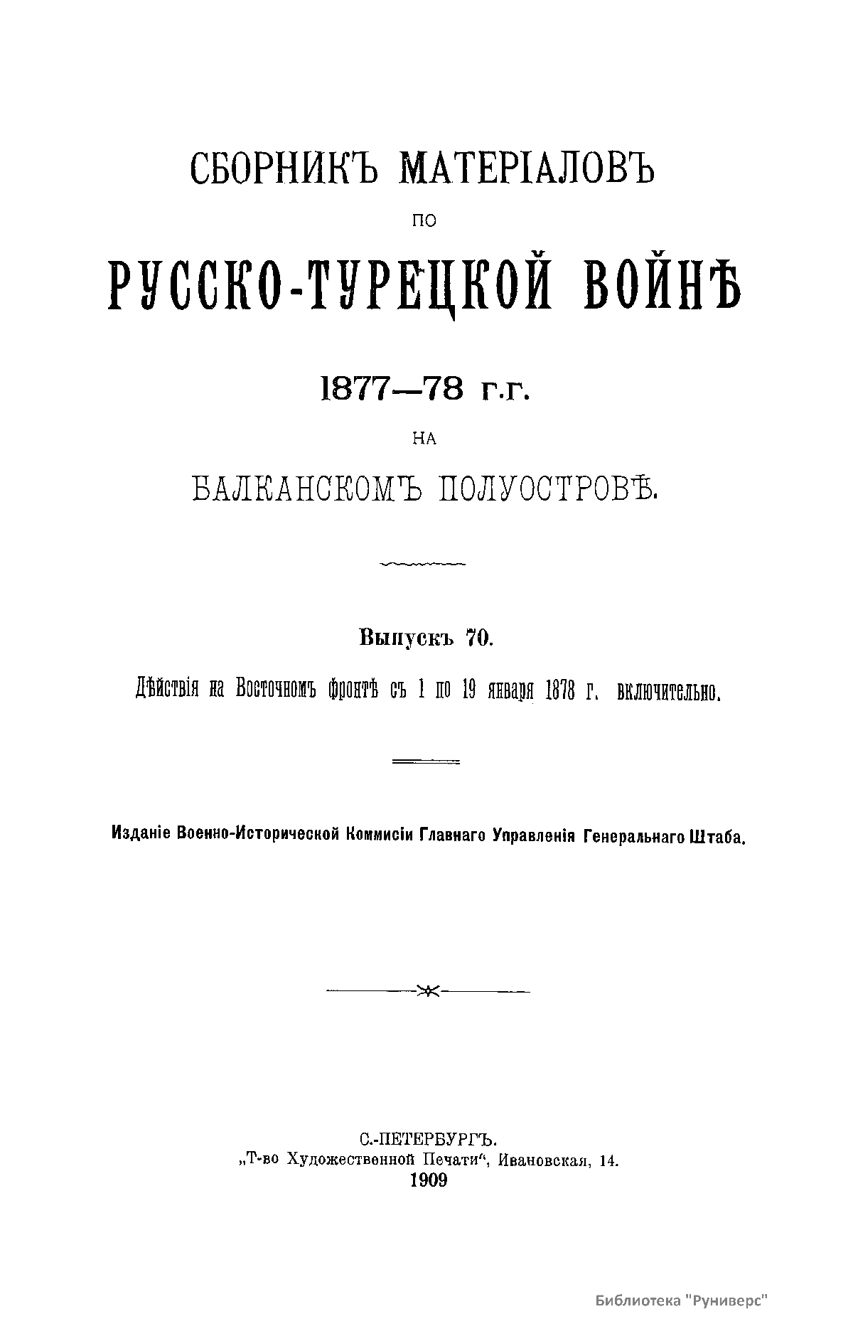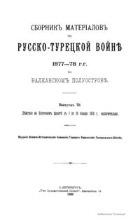 Сборникъ матерiаловъ по русско-турецкой войнѣ 1877-1878 г.г. на Балканскомъ полуостровѣ. Выпускъ 70. Дѣйствiя на Восточномъ фронтѣ съ 1 по 19 января 1878 г. включительно