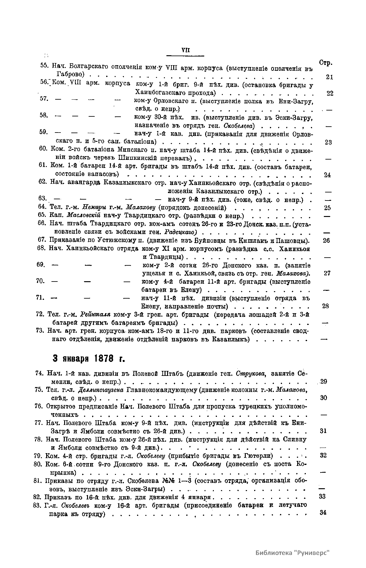 Военно-историческая комиссия Генерального штаба представляет сборник материалов по русско-турецкой войне 1877 – 1878 гг. на Балканском полуострове в 97 выпусках. Издание формирует полное представление о военных действиях и участниках этой войны. Русско-турецкая война 1877 – 1878 гг. была вызвана нежеланием Турции принять меры к улучшению положения подвластных ей христианских княжеств, обусловленному парижским трактатом 1856 г, и стремлением России укрепить свое влияние на Балканах. Способствовала освобождению народов Балканского полуострова от османского владычества. Россия объявила войну Турции 12 апреля 1877 г. Основные события: 1877 – сражение на Шипке, осада и взятие русскими войсками Плевны и Карса; 1878 – зимний переход русской армии через Балканский хребет, победы у Шипки – Шейново, Филиппополя, взятие Адрианополя. Завершилась Сан-Стефанским миром 1878 г., который обеспечил независимость балканским народам и территориальные приобретения России. Но Берлинский трактат ограничил независимость Болгарии и влияние России на Балканах.