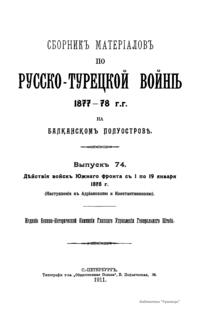 Сборникъ матерiаловъ по русско-турецкой войнѣ 1877-1878 г.г. на Балканскомъ полуостровѣ. Выпускъ 74. Дѣйствiя войскъ Южнаго фронта съ 1 по 19 января 1878 г. (Наступленiе къ Адрiанополю и Константинополю)