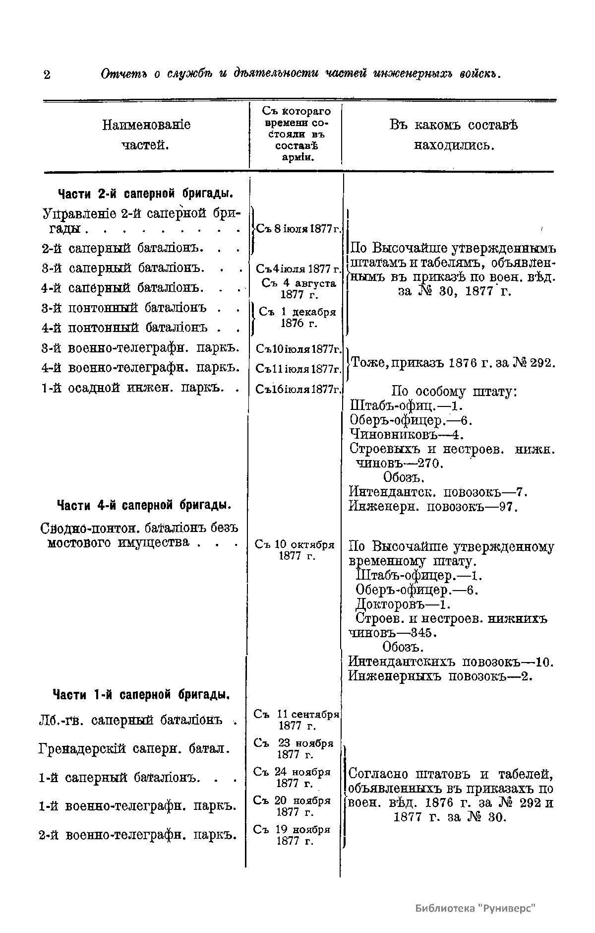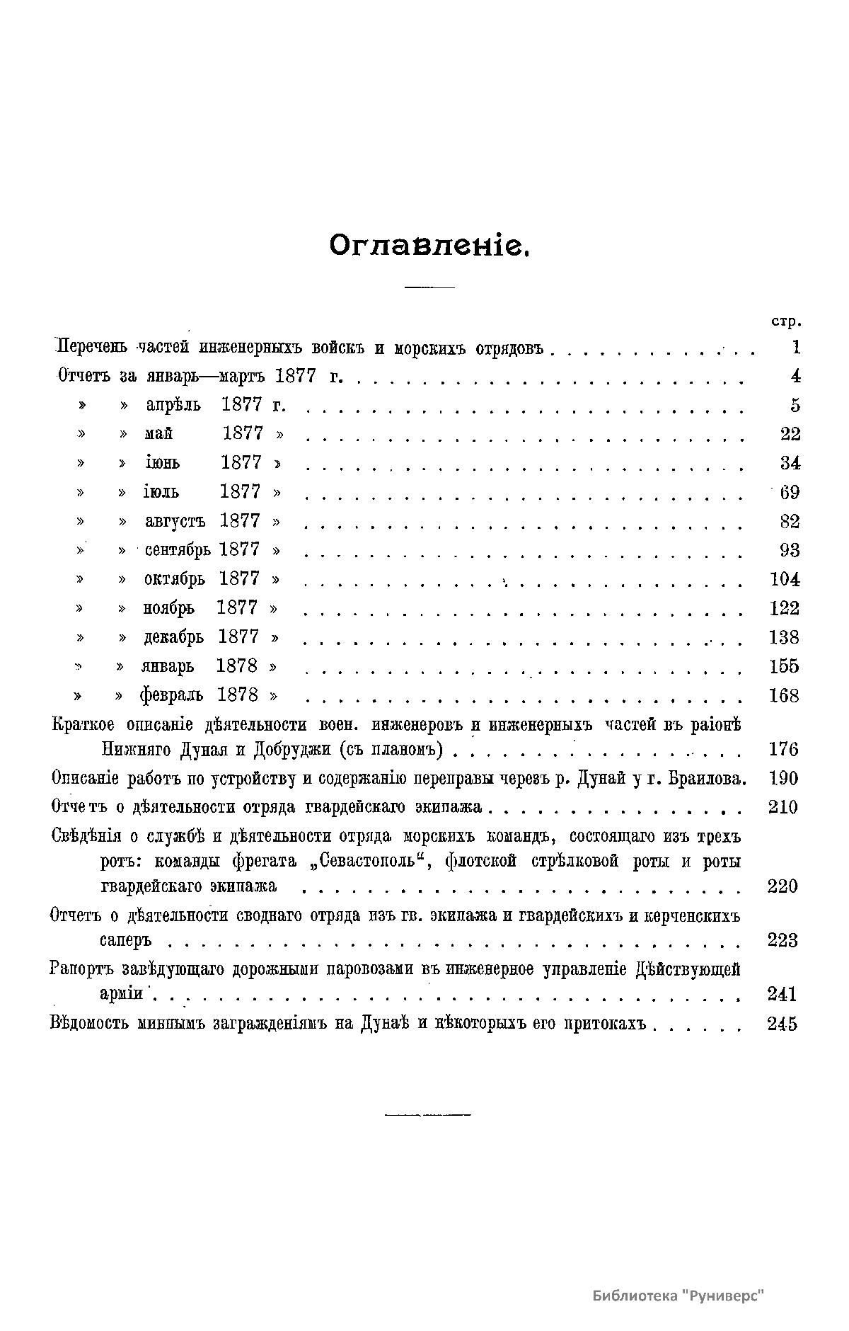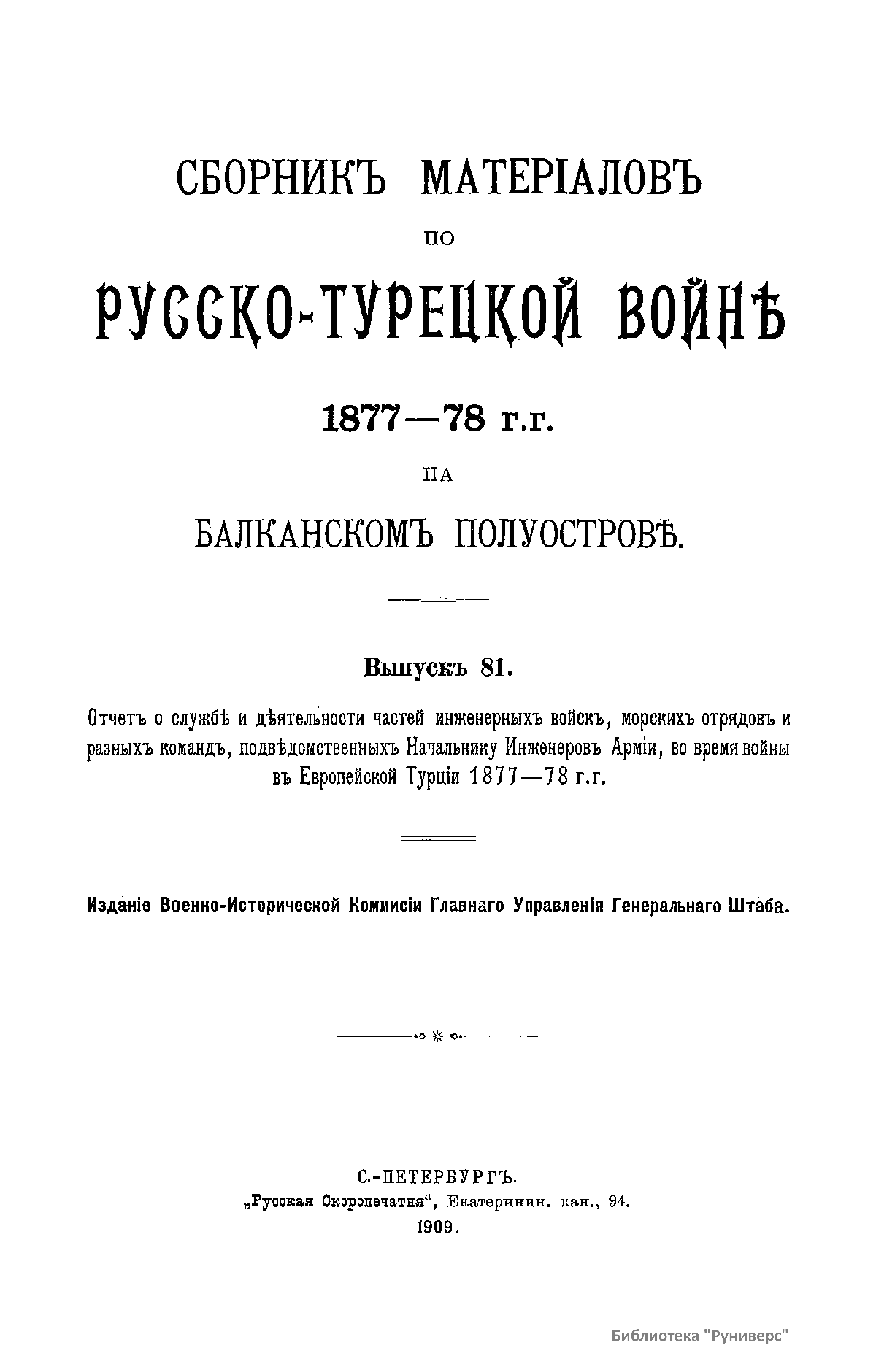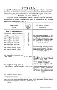 Сборникъ матерiаловъ по русско-турецкой войнѣ 1877-1878 г.г. на Балканскомъ полуостровѣ. Выпускъ 81. Отчетъ о службѣ и дѣятельности частей инженерныхъ войскъ, морскихъ отрядовъ и разныхъ командъ, подвѣдомственныхъ Начальнику Инженеровъ Армiи, во время войны въ Европейской Турцiи 1877-78 г.г.