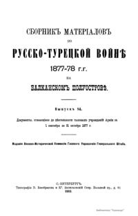 Военно-историческая комиссия Генерального штаба представляет сборник материалов по русско-турецкой войне 1877 – 1878 гг. на Балканском полуострове в 97 выпусках. Издание формирует полное представление о военных действиях и участниках этой войны. Русско-турецкая война 1877 – 1878 гг. была вызвана нежеланием Турции принять меры к улучшению положения подвластных ей христианских княжеств, обусловленному парижским трактатом 1856 г, и стремлением России укрепить свое влияние на Балканах. Способствовала освобождению народов Балканского полуострова от османского владычества. Россия объявила войну Турции 12 апреля 1877 г. Основные события: 1877 – сражение на Шипке, осада и взятие русскими войсками Плевны и Карса; 1878 – зимний переход русской армии через Балканский хребет, победы у Шипки – Шейново, Филиппополя, взятие Адрианополя. Завершилась Сан-Стефанским миром 1878 г., который обеспечил независимость балканским народам и территориальные приобретения России. Но Берлинский трактат ограничил независимость Болгарии и влияние России на Балканах.