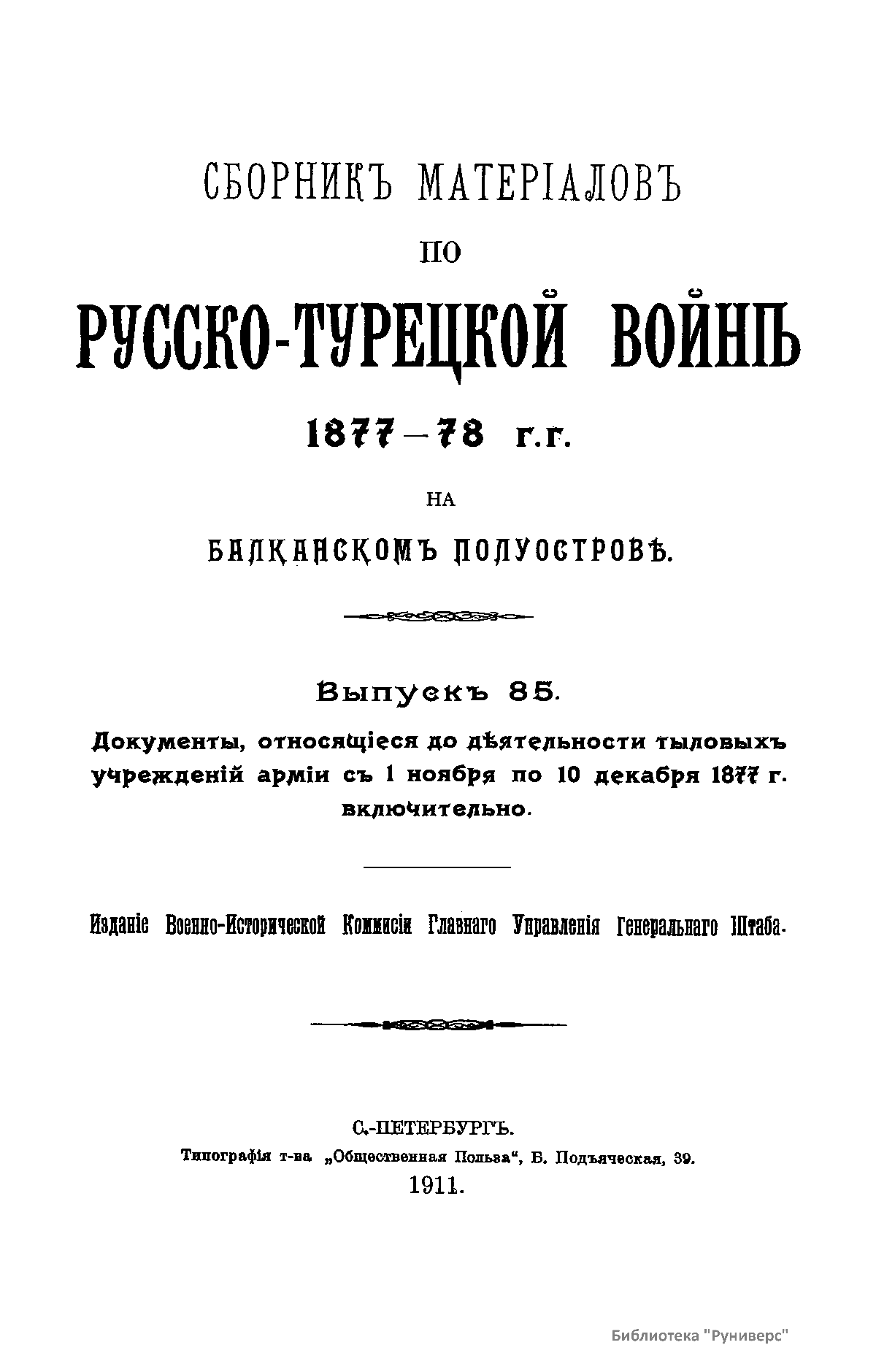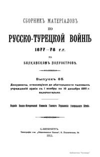 Сборникъ матерiаловъ по русско-турецкой войнѣ 1877-1878 г.г. на Балканскомъ полуостровѣ. Выпускъ 85. Документы, относящiеся до дѣятельности тыловыхъ учрежденiй армiи съ 1 ноября по 10 декабря 1877 г. включительно