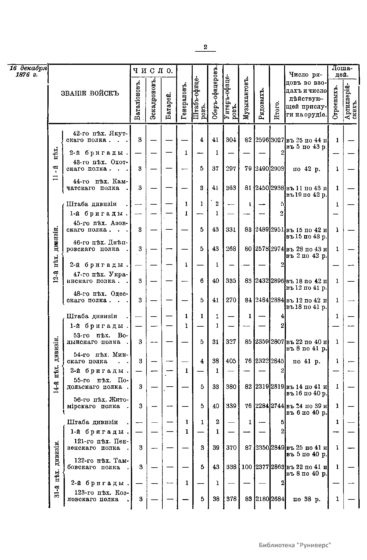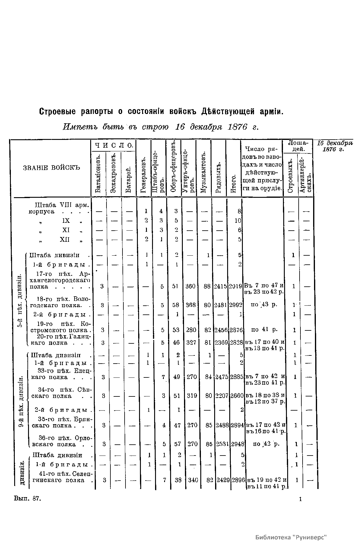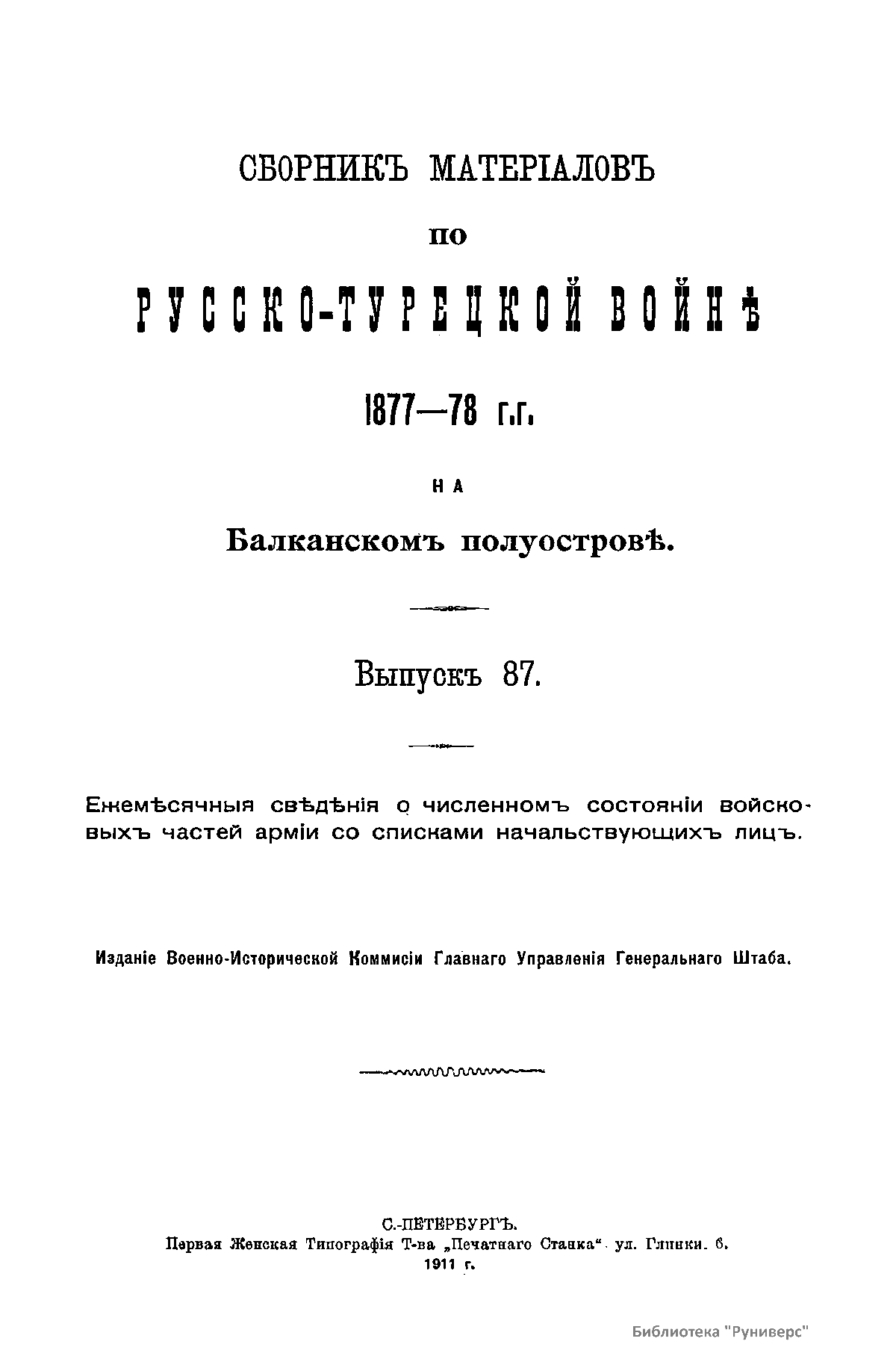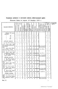 Сборникъ матерiаловъ по русско-турецкой войнѣ 1877-1878 г.г. на Балканскомъ полуостровѣ. Выпускъ 87. Ежемѣсячныя свѣдѣнiя о численномъ состоянiи восковыхъ частей армiи со списками начальствующихъ лицъ