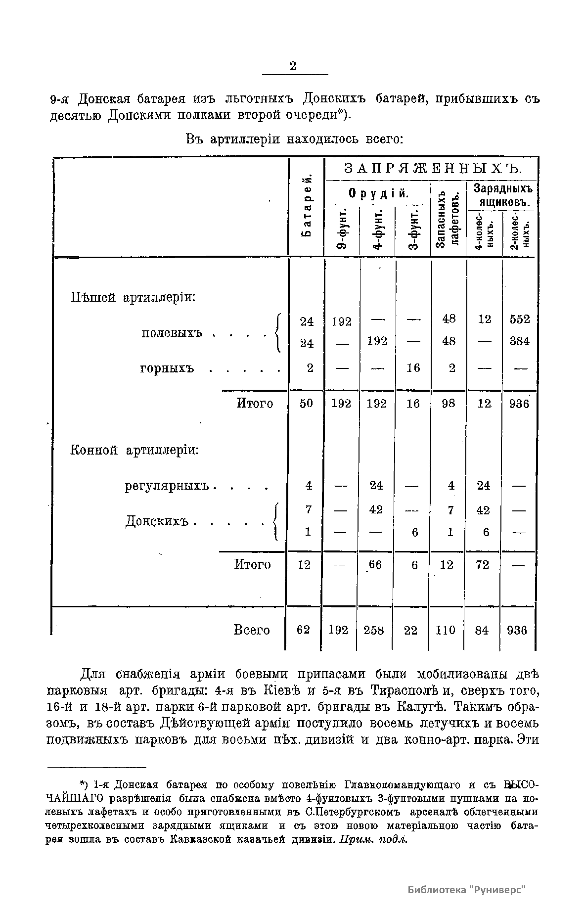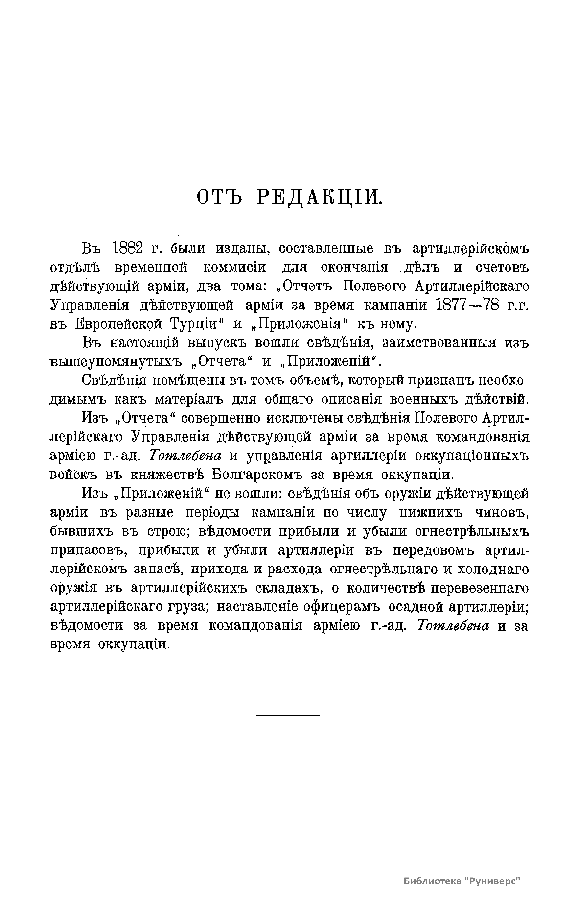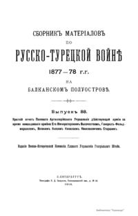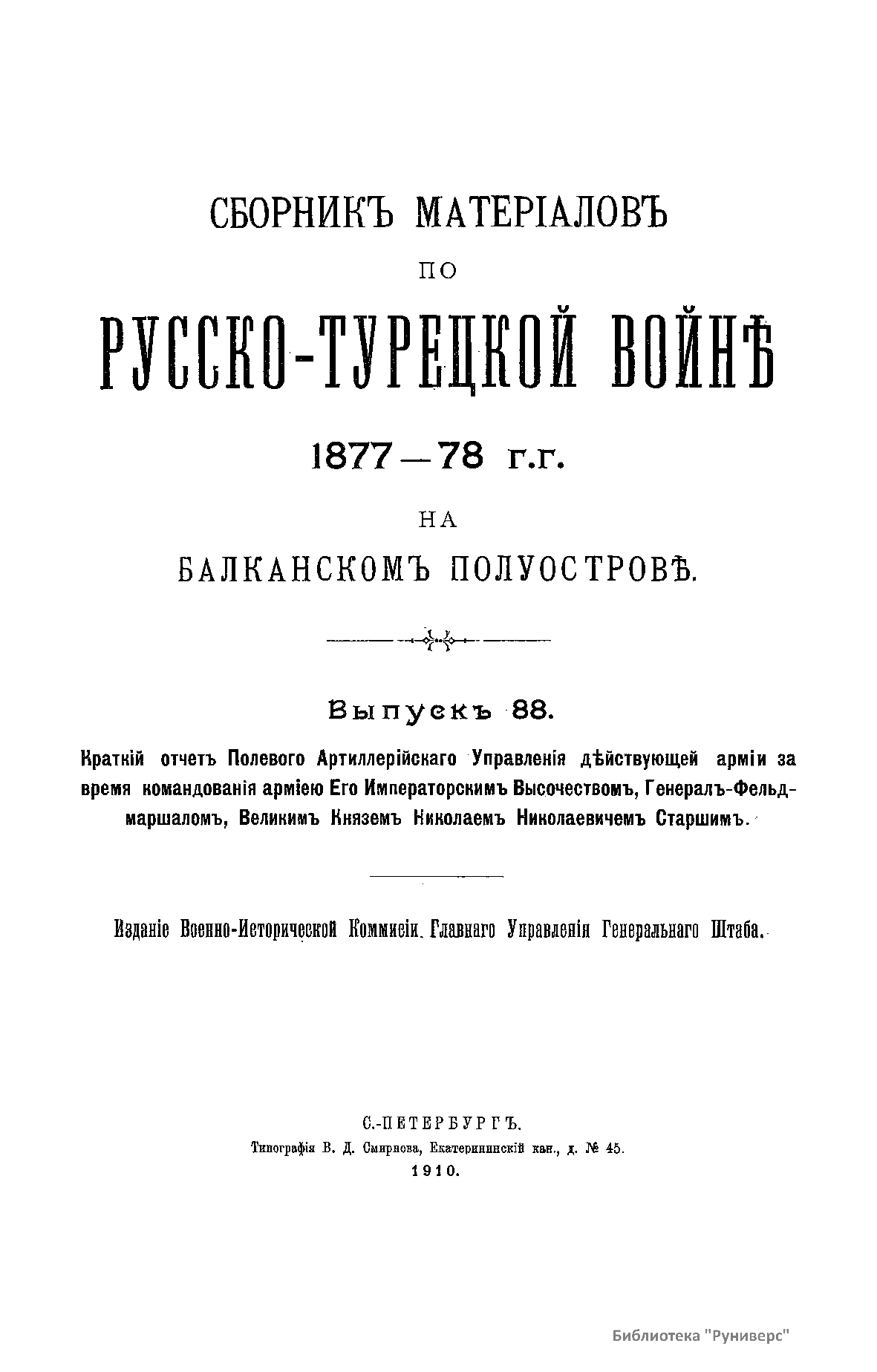 Сборникъ матерiаловъ по русско-турецкой войнѣ 1877-1878 г.г. на Балканскомъ полуостровѣ. Выпускъ 88. Краткiй отчетъ Полевого Артиллерiйскаго Управленiя дѣйствующей армiи за время командованiя армiею Его Императорскимъ Высочествомъ, Генералъ-Фельдмаршаломъ, Великимъ Княземъ Николаемъ Николаевичемъ Страшимъ