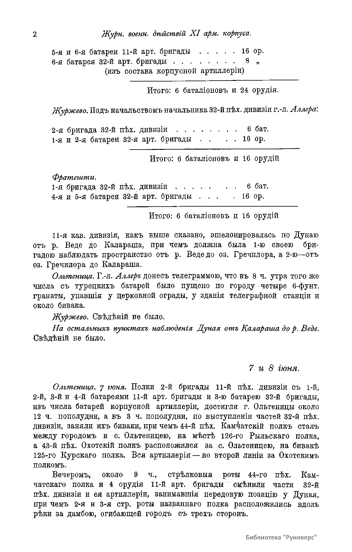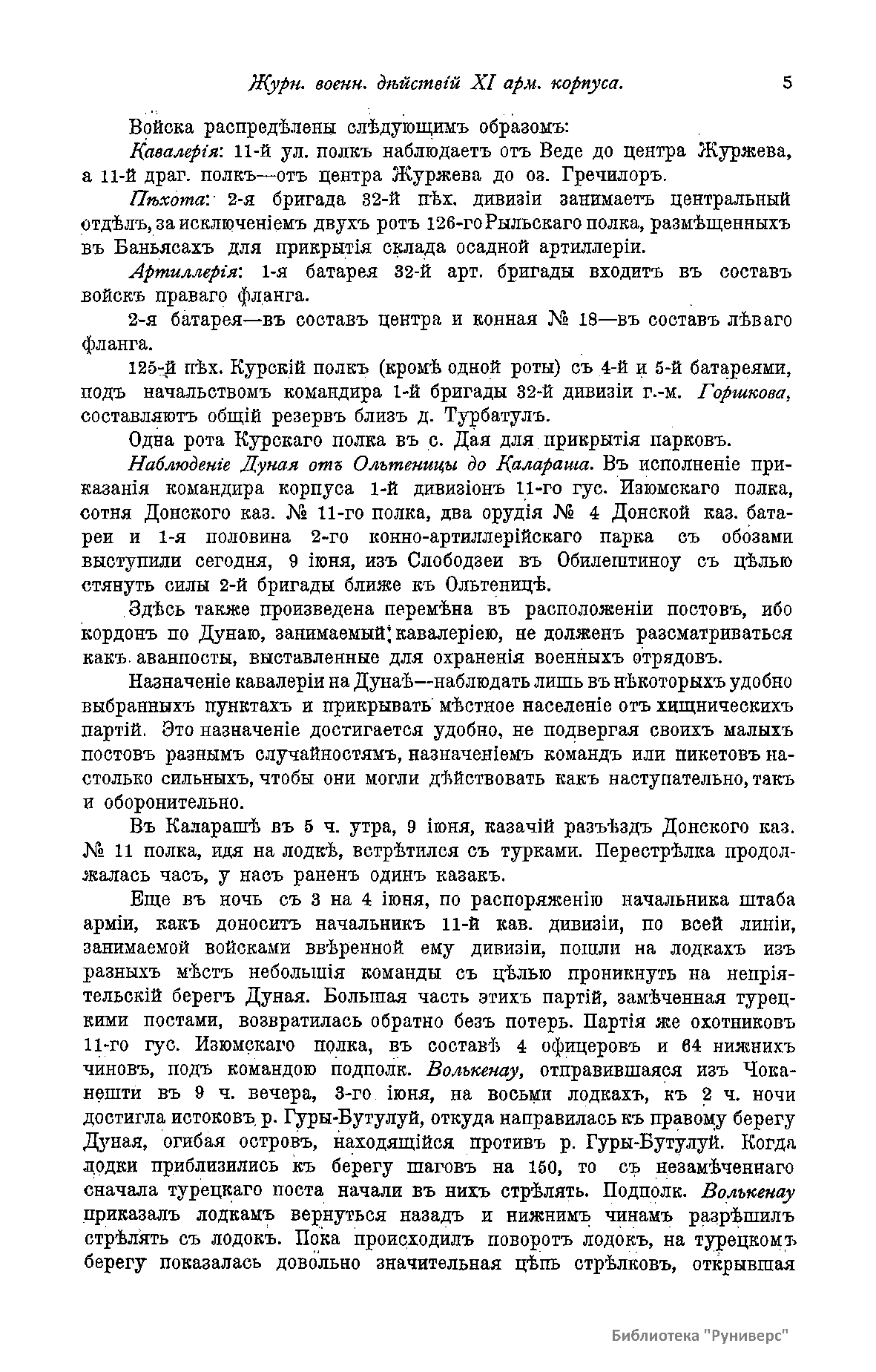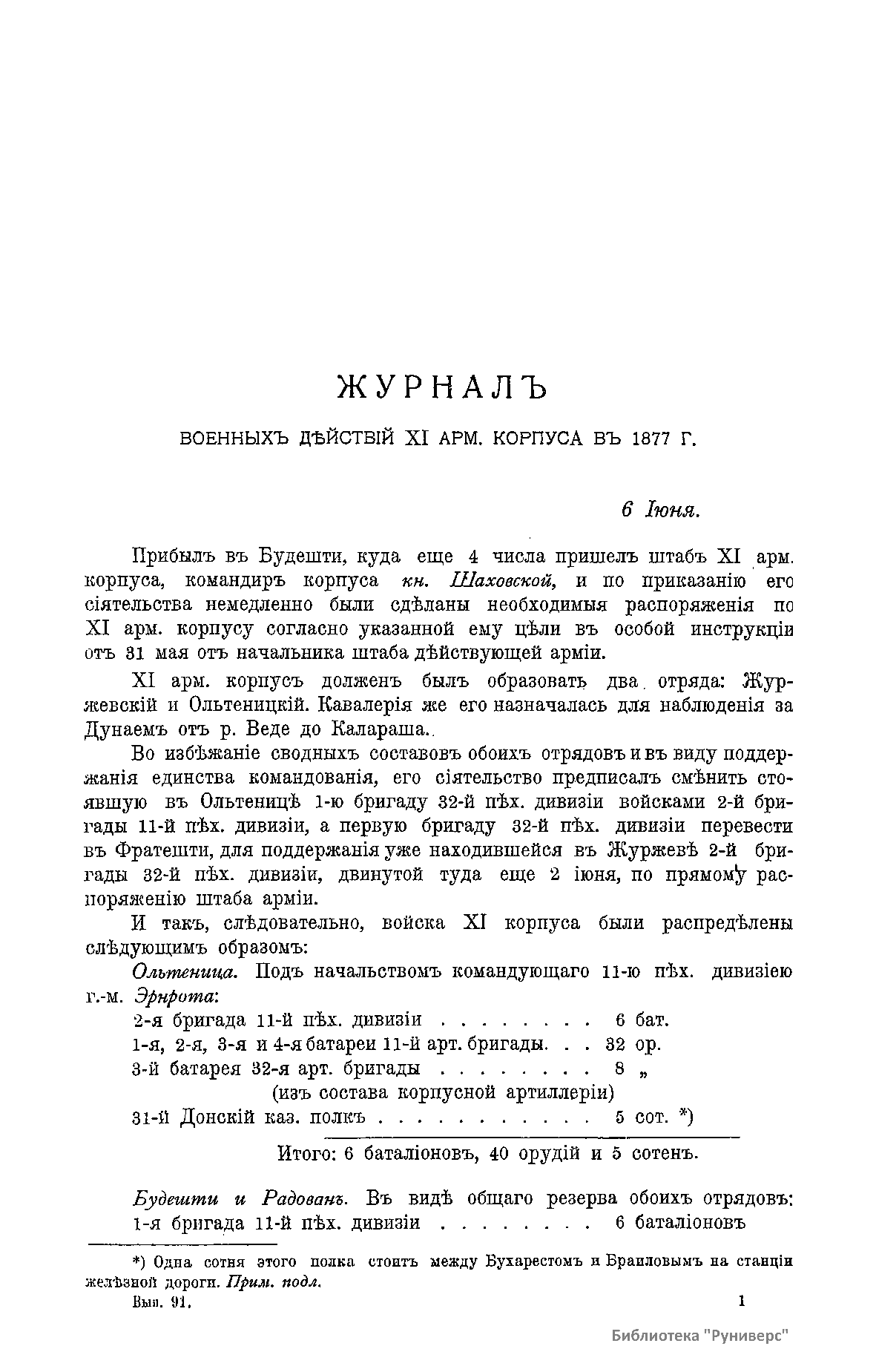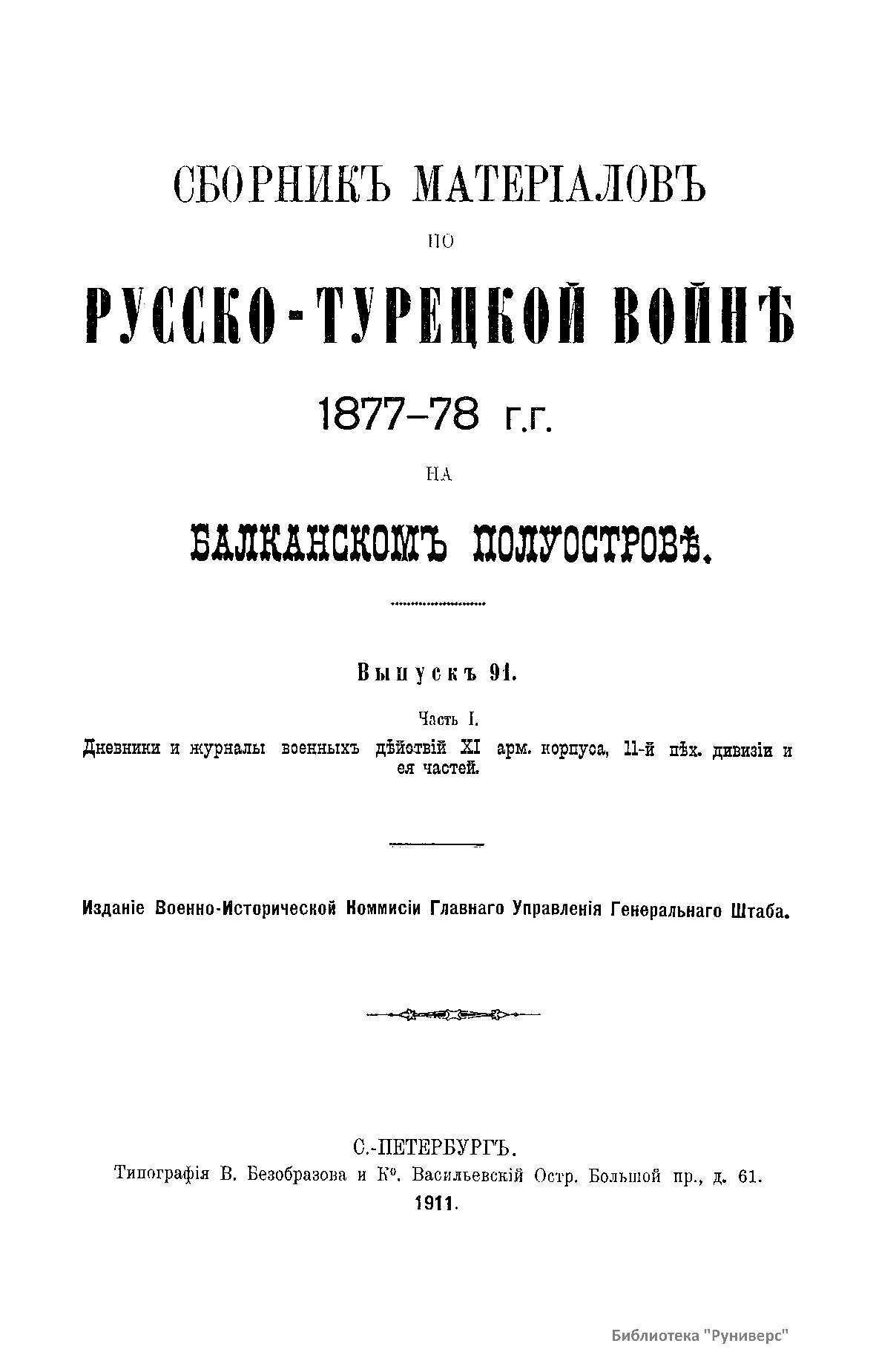 Сборникъ матерiаловъ по русско-турецкой войнѣ 1877-1878 г.г. на Балканскомъ полуостровѣ. Выпускъ 91. Часть I. Дневники и журналы военныхъ дѣйствiй XI арм. корпуса 11-й пѣх. дивизiи и ея частей