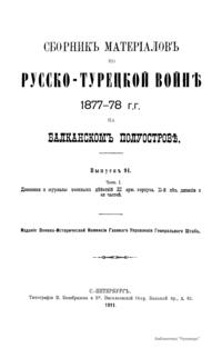 Военно-историческая комиссия Генерального штаба представляет сборник материалов по русско-турецкой войне 1877 – 1878 гг. на Балканском полуострове в 97 выпусках. Издание формирует полное представление о военных действиях и участниках этой войны. Русско-турецкая война 1877 – 1878 гг. была вызвана нежеланием Турции принять меры к улучшению положения подвластных ей христианских княжеств, обусловленному парижским трактатом 1856 г, и стремлением России укрепить свое влияние на Балканах. Способствовала освобождению народов Балканского полуострова от османского владычества. Россия объявила войну Турции 12 апреля 1877 г. Основные события: 1877 – сражение на Шипке, осада и взятие русскими войсками Плевны и Карса; 1878 – зимний переход русской армии через Балканский хребет, победы у Шипки – Шейново, Филиппополя, взятие Адрианополя. Завершилась Сан-Стефанским миром 1878 г., который обеспечил независимость балканским народам и территориальные приобретения России. Но Берлинский трактат ограничил независимость Болгарии и влияние России на Балканах.