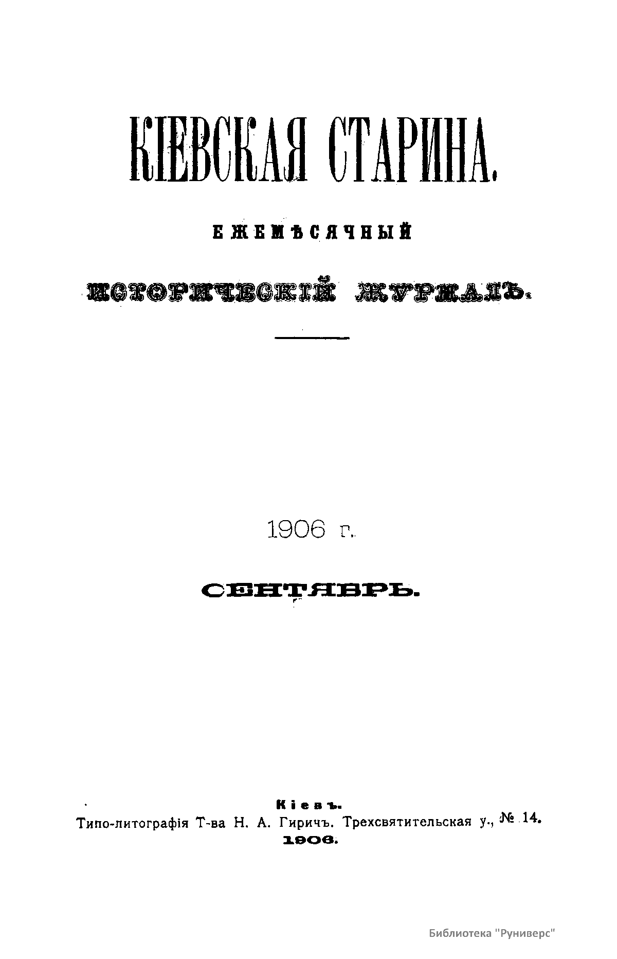Киевская старина. Год двадцать пятый. Том XCIV. Сентябрь-Декабрь 1906 г.