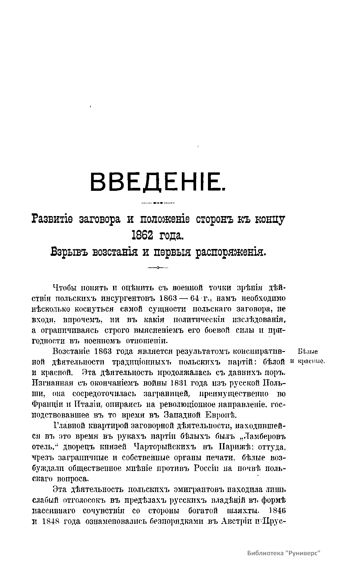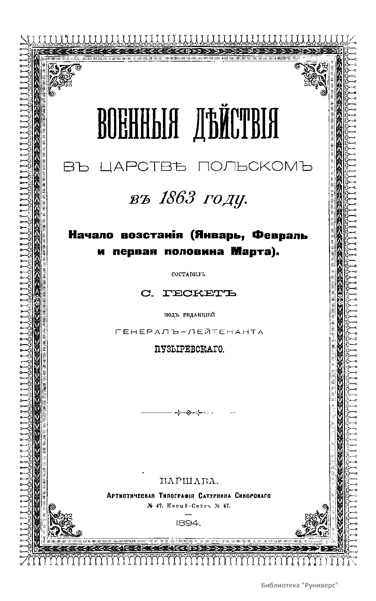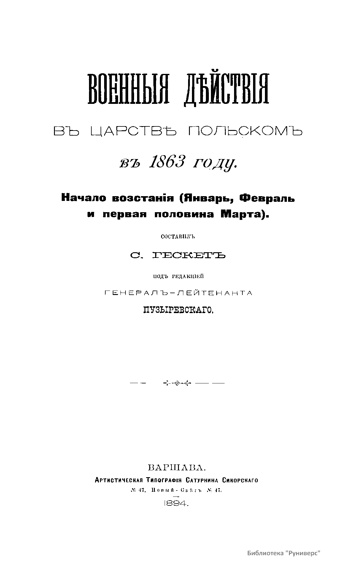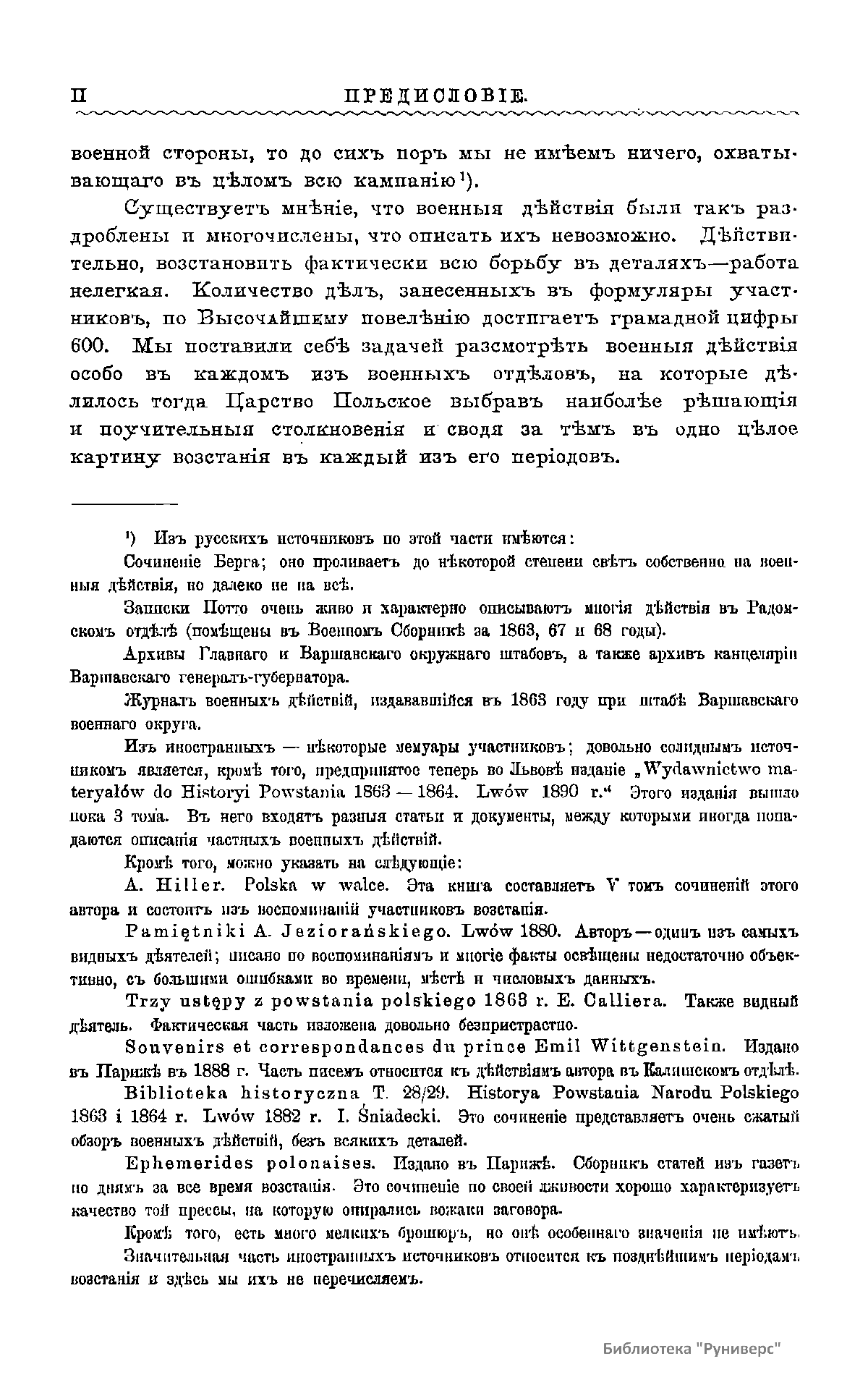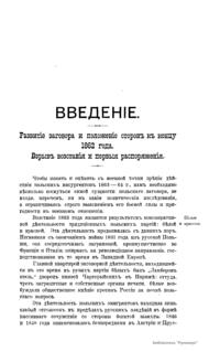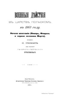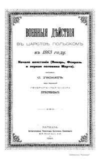 Автор ставит цель осветить восстание с военной точки зрения, не касаясь его причин и вопросов внутренней политики. Он рассматривает военные действия особо в каждом из военных отделов, на которые делилось тогда Царство Польское, выбрав решающие и поучительные столкновения, и сводит затем в одно целое картину восстания в каждый из его периодов (таких периодов было три). Настоящий труд посвящен рассмотрению военных действий в первый период: в ночь с 10 на 11 января 1863 г. до середины марта.