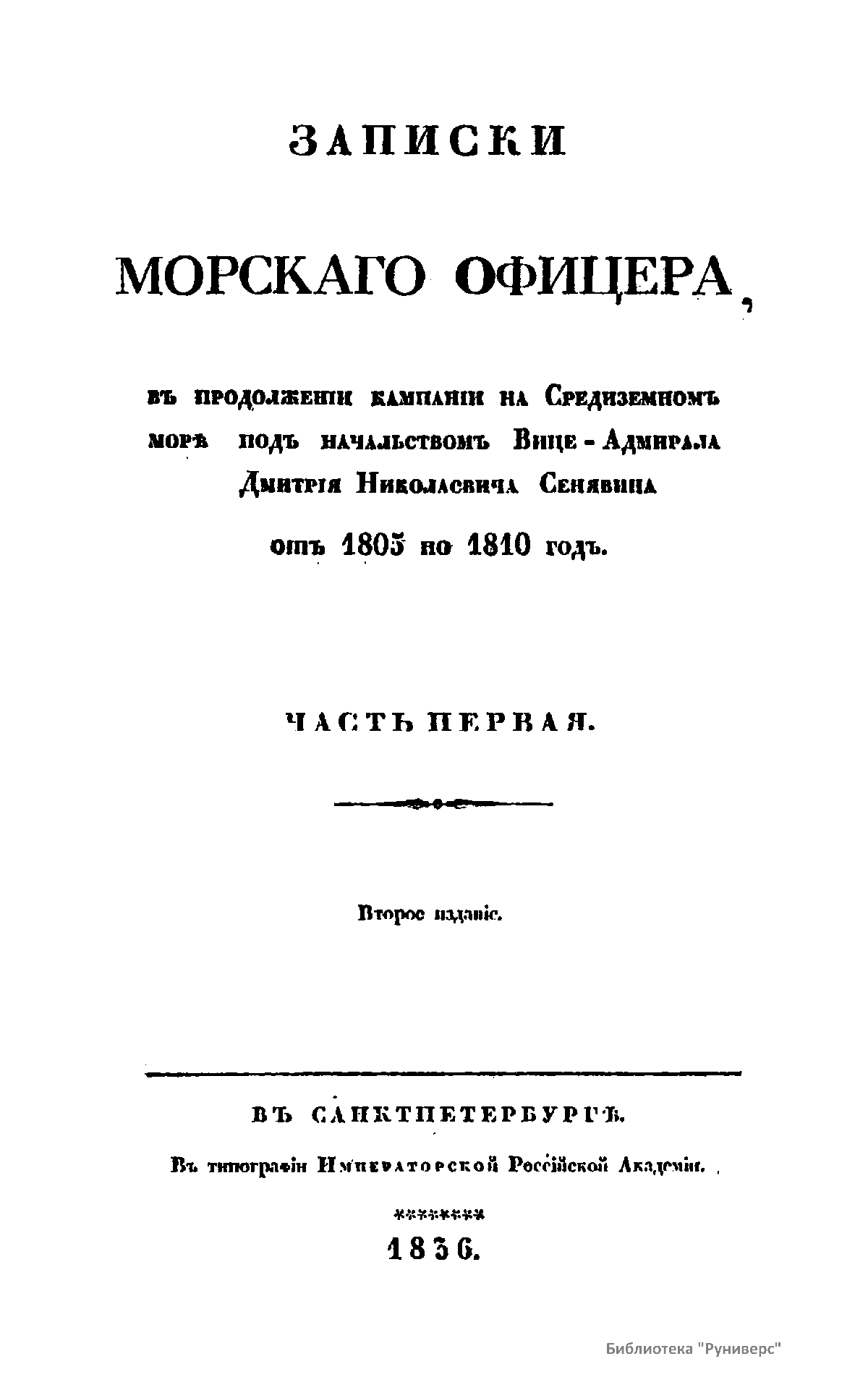Записки морскаго офицера, въ продолженiи кампанiи на Средиземномъ морѣ подъ начальствомъ Вице-Адмирала Дмитрiя Николаевича Сенявина отъ 1805 по 1810 годъ. Часть первая