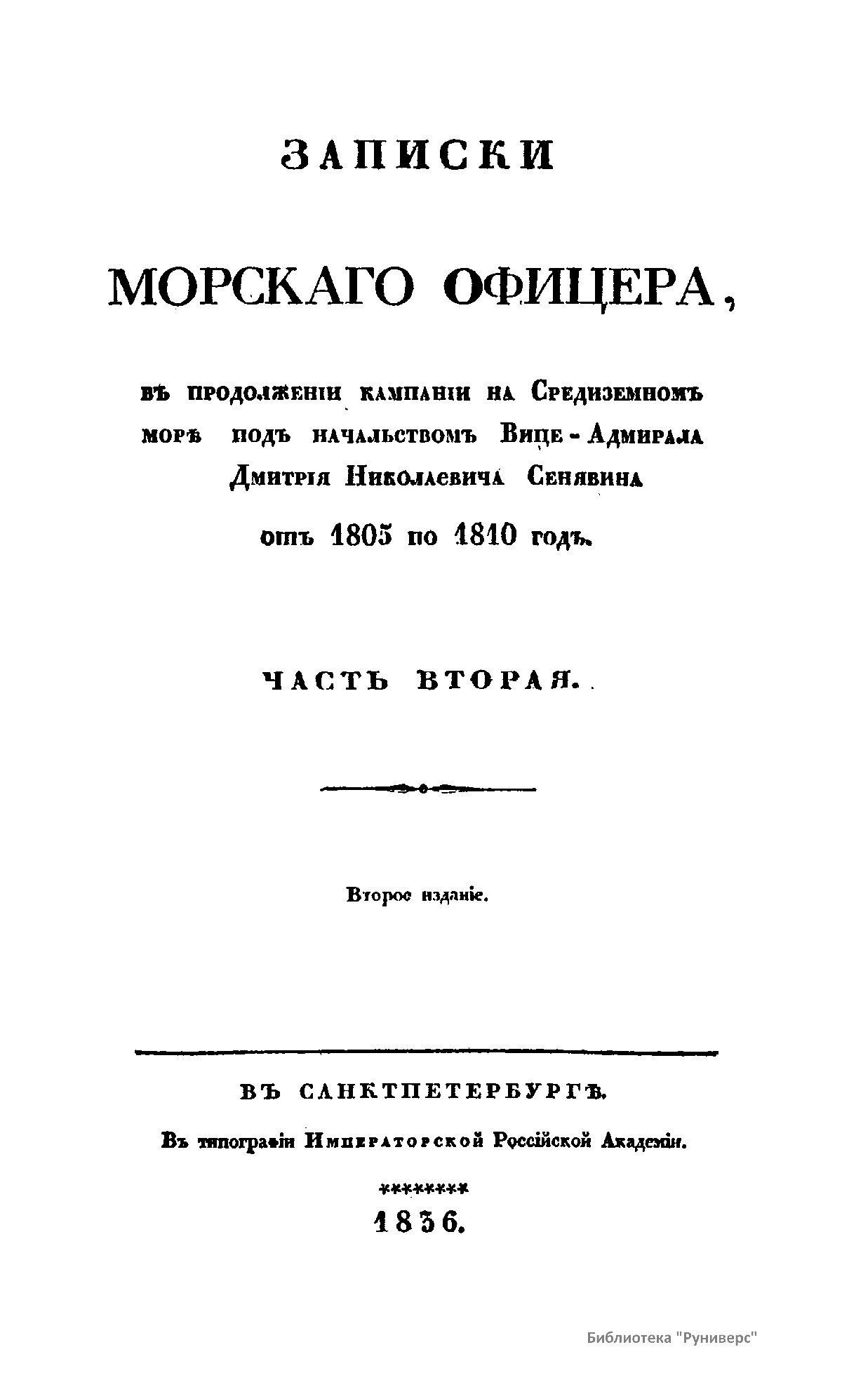 Записки морскаго офицера, въ продолженiи кампанiи на Средиземномъ морѣ подъ начальствомъ Вице-Адмирала Дмитрiя Николаевича Сенявина отъ 1805 по 1810 годъ. Часть вторая
