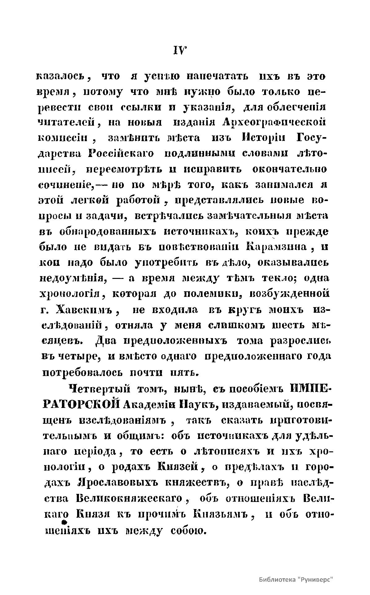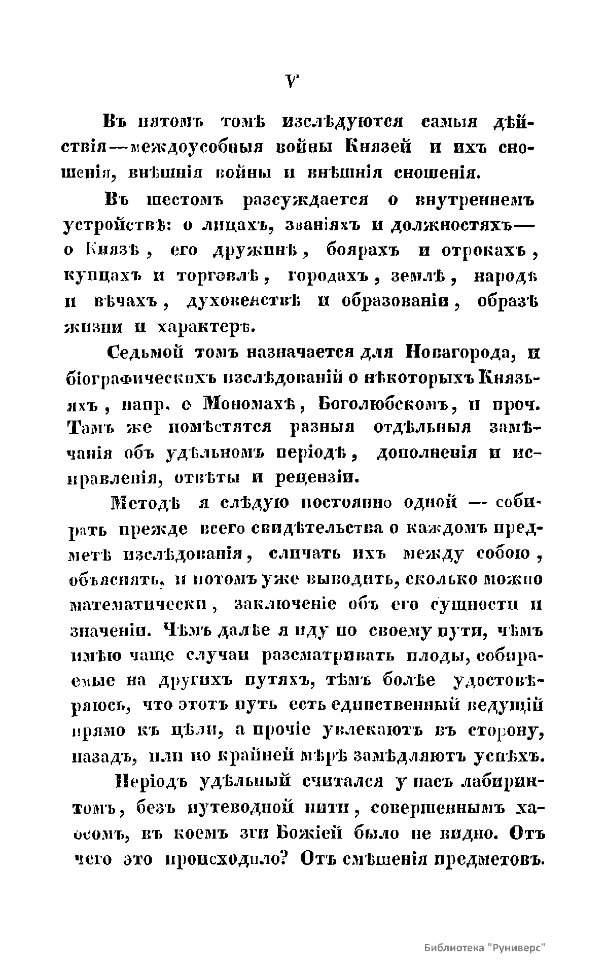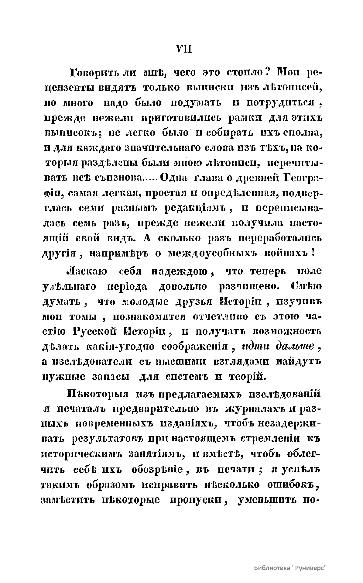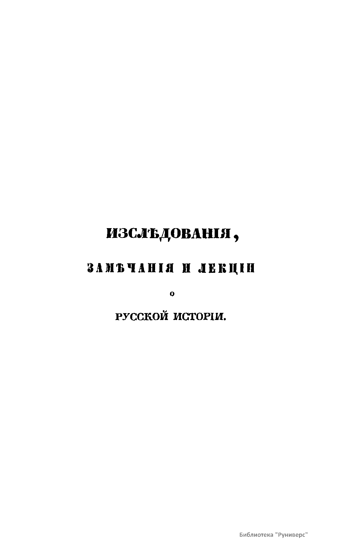 «На пользу науке, на славу Отечества, к чести своего времени» Первый том посвящен источникам древнейшей русской истории и преимущественно Несторовой летописи. В его состав вошло уже напечатанное прежде исследование, к которому присоединены замечания о прочих источниках: Русской правде, церковных уставах, северных сагах и пр. Приведен разбор всех мнений о Несторовой летописи. Предмет второго тома – происхождение Варягов-Руси. Здесь помещено первое рассуждение автора об этом предмете, исправленное и дополненное новыми исследованиями и открытиями. Автор разбирает также новые мнения о происхождении Варягов-Руси. В этом томе опубликованы лекции о славянах, в которых заключается краткое извлечение о Славянских Древностях Шафарика. Третий том содержит исследования и замечания о событиях первого периода, который автор называет Варяжским, или Норманским (862 – 1054), с объяснением всех мест Несторовой летописи, и сравнение русского начала с началом прочих западных государств, где показан источник различия между их последующими историями. Четвертый том посвящен приготовительным и общим исследованиям: об источниках для удельного периода, т.е. о летописях и их хронологии, о родах князей, о пределах и городах Ярославовых княжеств, о праве великокняжеского наследства, об отношении великого князя к прочим князьям, об отношении их между собой. В пятом томе исследуются междуусобные войны князей и их сношения, внешние войны и внешние сношения. В шестом томе автор приводит азбучный список русских князей до монгольского ига; список русских князей до монгольского ига по степеням и старшинству; список князей по княжествам и уделам. В седьмом томе автор рассуждает о князе, его дружине, боярах и отроках; о городах и их обитателях; о волостях и их отношении к городам; о военном деле; о праве; торговле; церкви, грамотности и образовании.