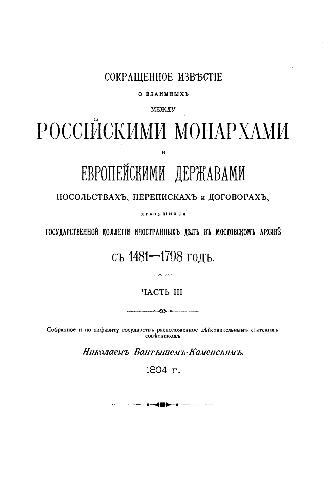 Посмертное издание ключевого труда бессменного (в течение почти 50 лет) археографа и управляющего Московским Главным архивом коллегии иностранных дел - систематизированное изложение документов о посольствах между российскими монархами и европейскими державами, дипломатической переписки и договоров.