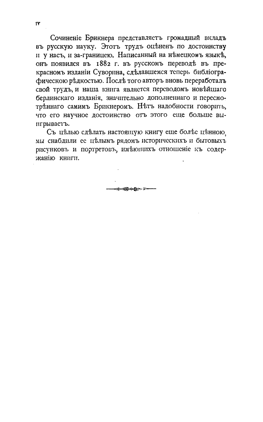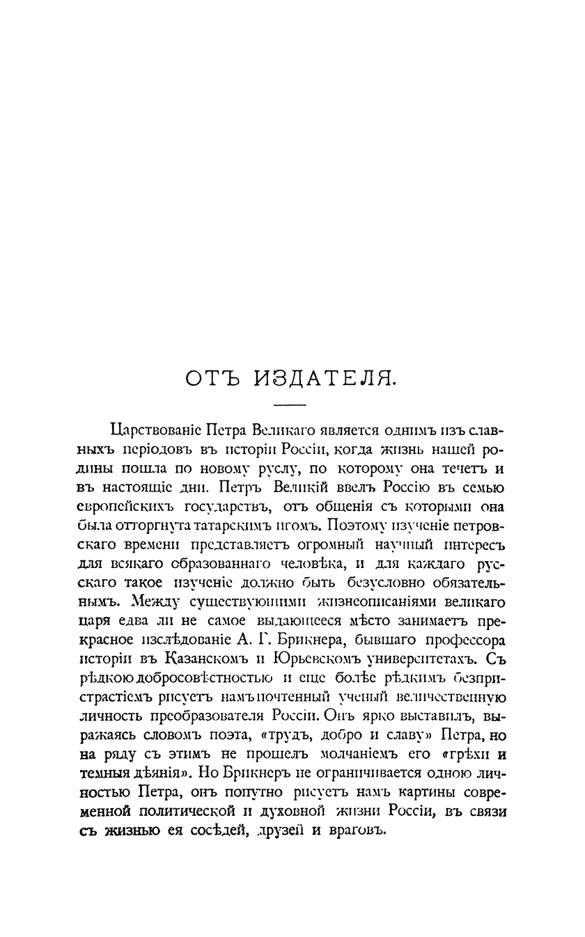 «История Петра», как и другие книги Брикнера, была написана по-немецки и адресована в первую очередь европейскому читателю. Родившись в России, и оставаясь всю жизнь связанным с ней прочными узами, Брикнер, тем не менее, ощущал себя в ней человеком Запада. Он прожил в России почти всю свою жизнь, любил свою родину, гордился ей и посвятил ей все свои научные труды (включая главный - "Die Europaisirung Russlands", 1887), в которых с великим смирением признавал, что до полноценного вхождения в число передовых европейских стран России еще предстоит проделать немалый путь.