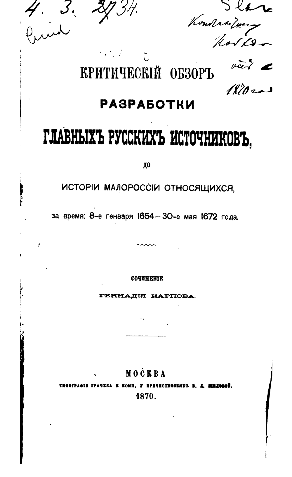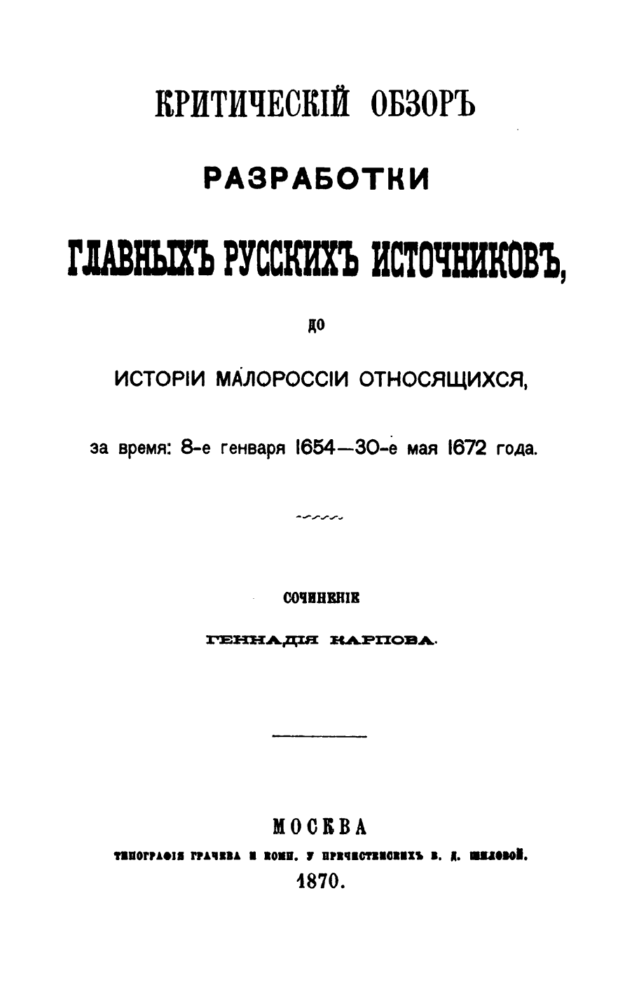 Критическiй обзоръ разработки главныхъ русскихъ источниковъ, до исторiи Малороссiи относящихся, за время: 8-е генваря 1654 - 30-е мая 1672 года