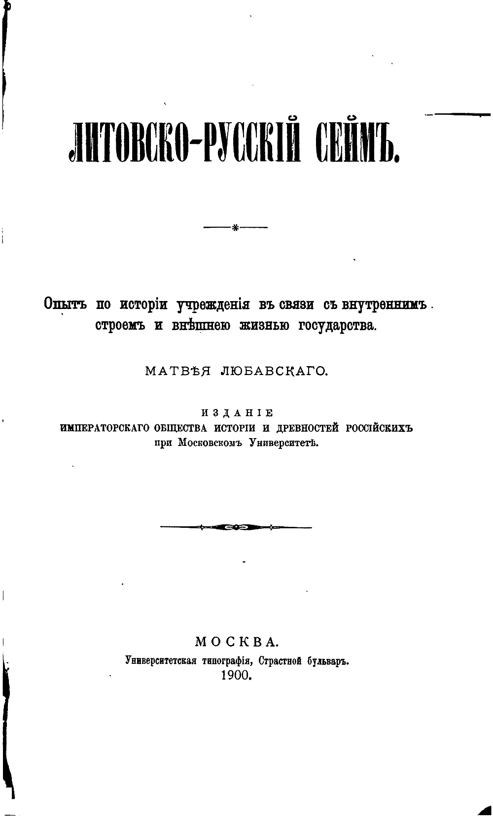 Литовско-русскiй Сеймъ. Опыт по исторiи учрежденiя въ связи съ внутреннимъ строемъ и внѣшней жизнью государства