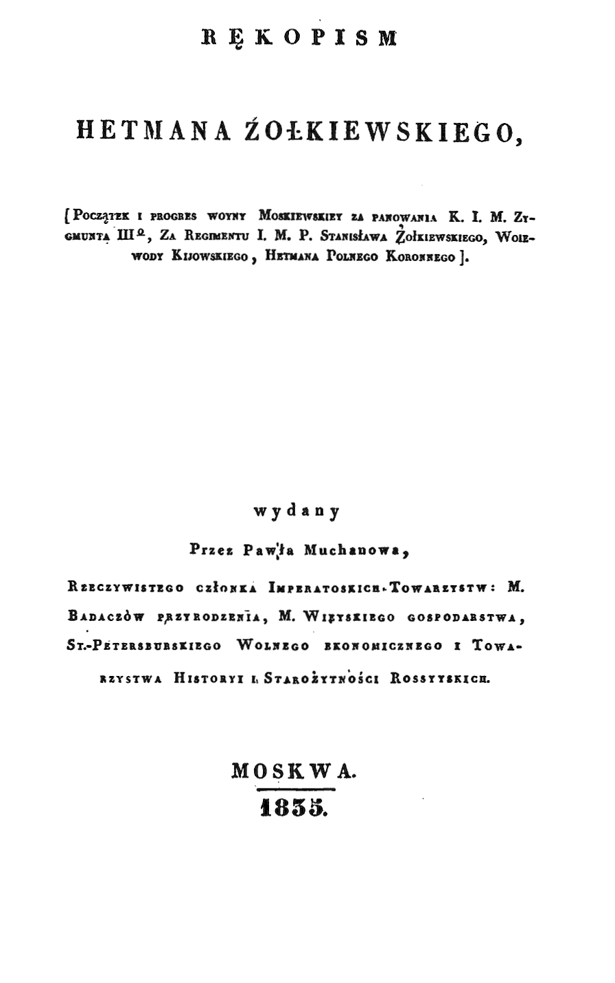 Издание знаменитой рукописи, в которой события Смутного времени собственноручно описаны «Покорителем Москвы» - коронным польным гетманом Станиславом Жолкевским, подготовлено к печати историком-археологом П.А. Мухановым (1798 - 1871).