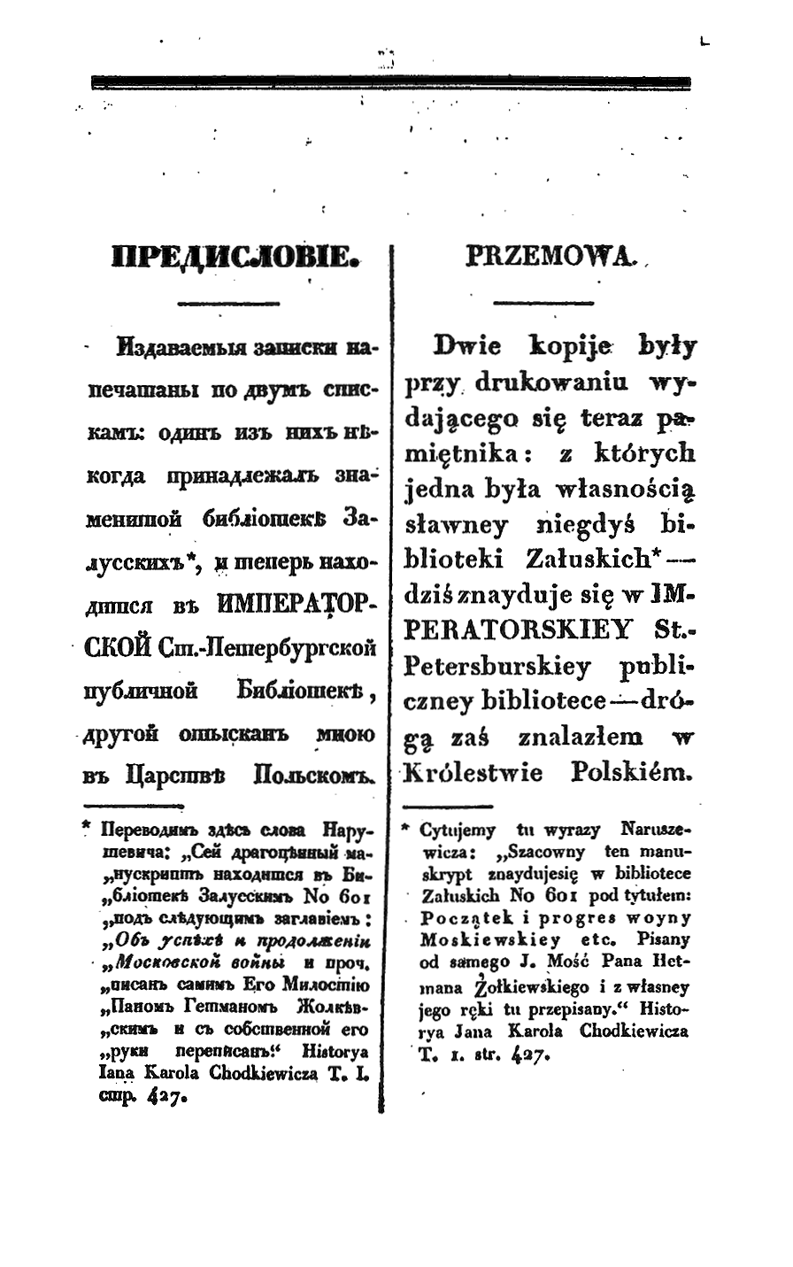 Об использованных источниках составитель сообщает: «Издаваемые записки напечатаны по двум спискам: один из них некогда принадлежал знаменитой библиотеке Залусских, и теперь находится в Императорской Ст. - Петербургской публичной Библиотеке, другой отыскан мною в Царстве Польском. По сличении сих двух списков оказывается, что последний списан с первого, по большей части слово в слово,— лишь в некоторых только местах встречаются изменения и прибавления, указанные в примечаниях. ...