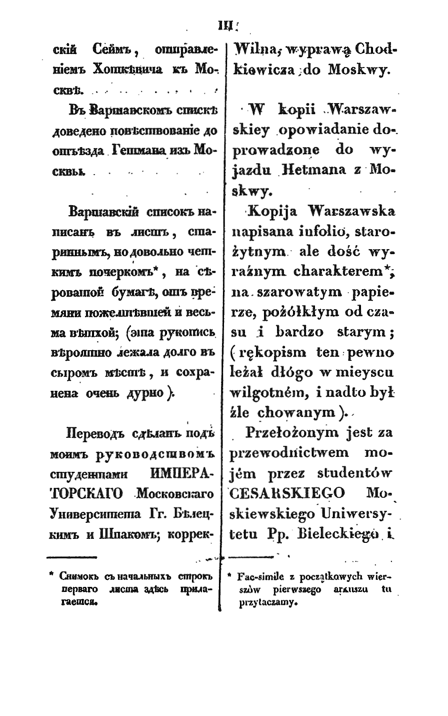 Перевод сделан под моим руководством студентами Императорского Московского Университета гг. Белецким и Шпаком; корректуру Польского текста держал г-н Савинич.» В конце книги составитель поместил ряд любопытных документов, сообщающих дополнительные подробности к ряду описанных Жолкевским эпизодов.