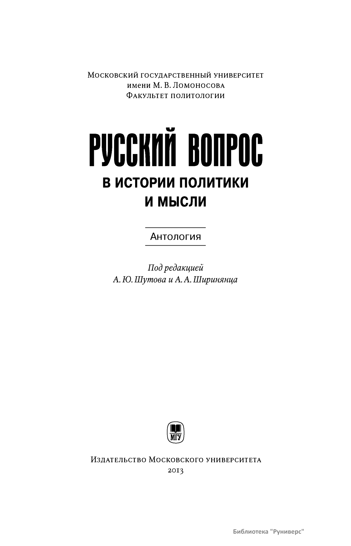 В антологии «Русский вопрос в истории политики и мысли» собраны работы английских, немецких, французских и польских политиков, литераторов и общественных деятелей XIX века. В книгу вошли литературные эссе, публичные выступления, политическая публицистика, научные статьи и фрагменты книг, а также антирусские карикатуры того времени, т. е. все, что формировало неприязненное отношение европейского общественного мнения к России и русским. Часть публикуемых текстов впервые переведена на русский язык. Издание снабжено комментариями. Для студентов гуманитарных факультетов университетов, а также всех, кто интересуется историей политики и социально-политической мысли.