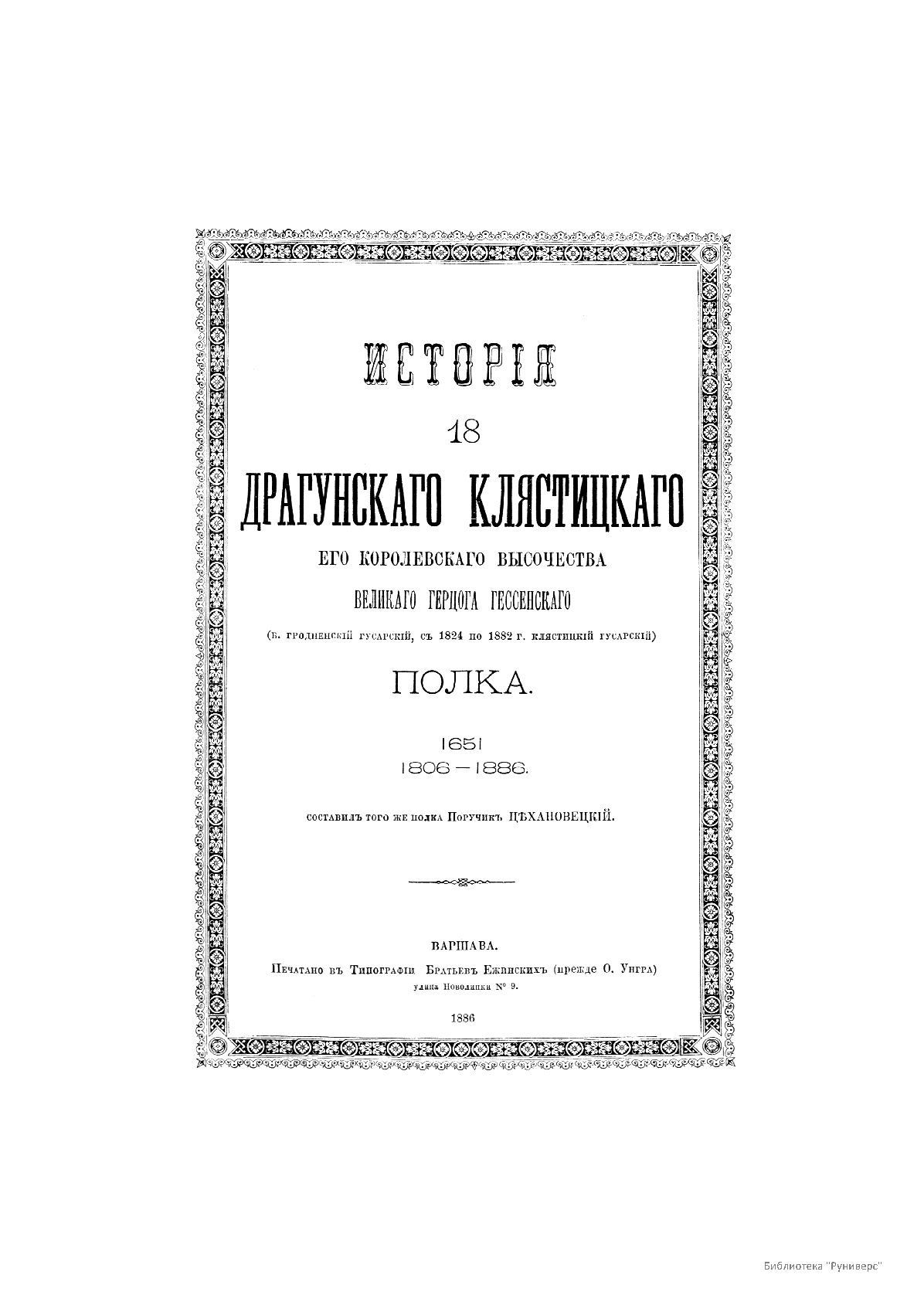 В 1886 г. в Варшаве, входившей в то время в состав Российской империи, вышла в свет книга поручика В. П. Цехановецкого, посвященная истории 18-го драгунского Клястицкого полка. Клястицкий полк был сформирован в г. Торопце Псковской губернии в июне 1806 г. под названием Гродненского гусарского полка. Боевое крещение полк получил уже через полгода: в январе 1807 г. в сражении при Прейсиш-Эйлау. Зимой 1808–1809 гг. полк совершил беспримерный поход в Швецию по льду Ботнического залива. В Отечественной войне 1812 г. Гродненский гусарский полк заслужил две почетные коллективные награды: серебряные трубы с памятной надписью и знаки на кивера «За отличие».