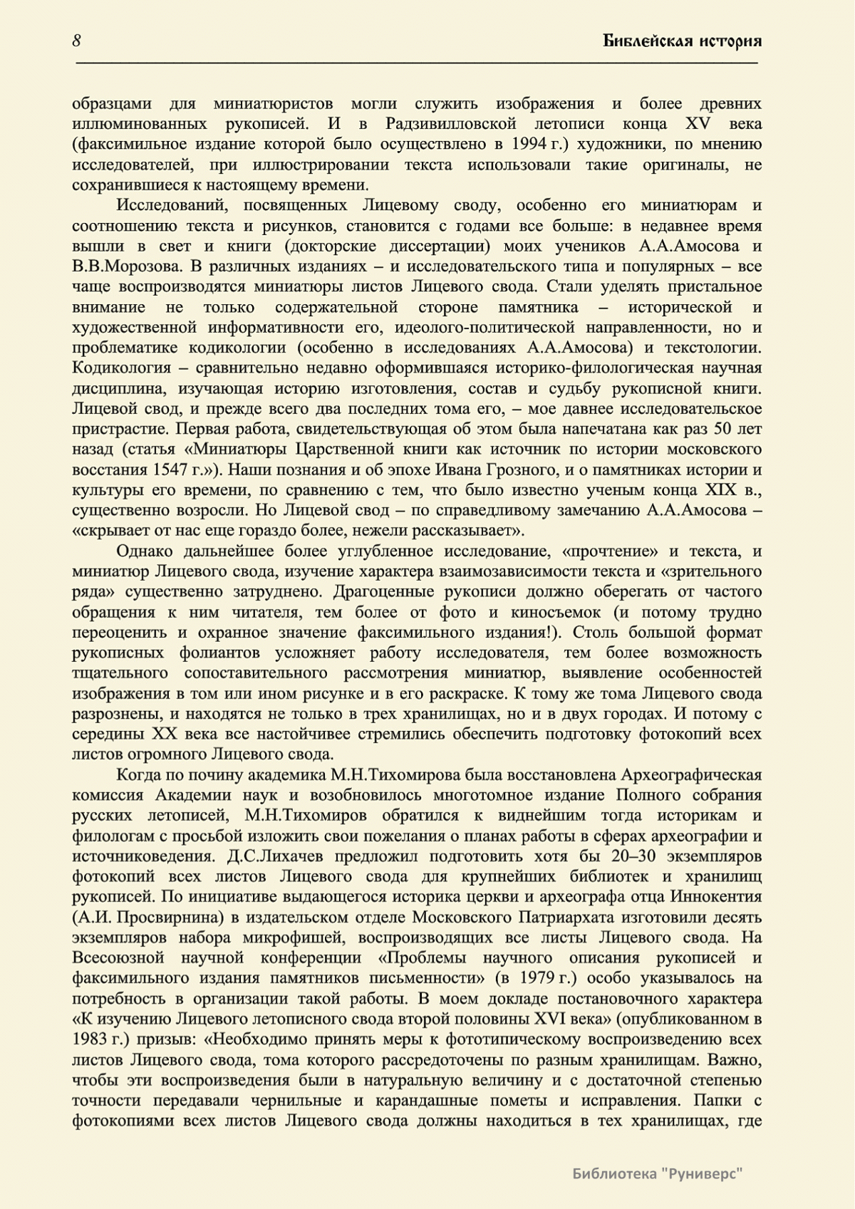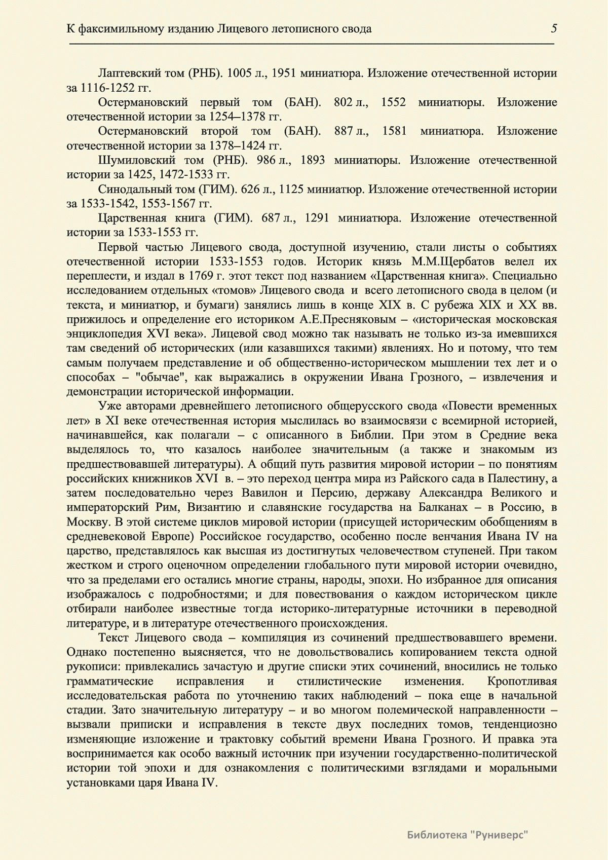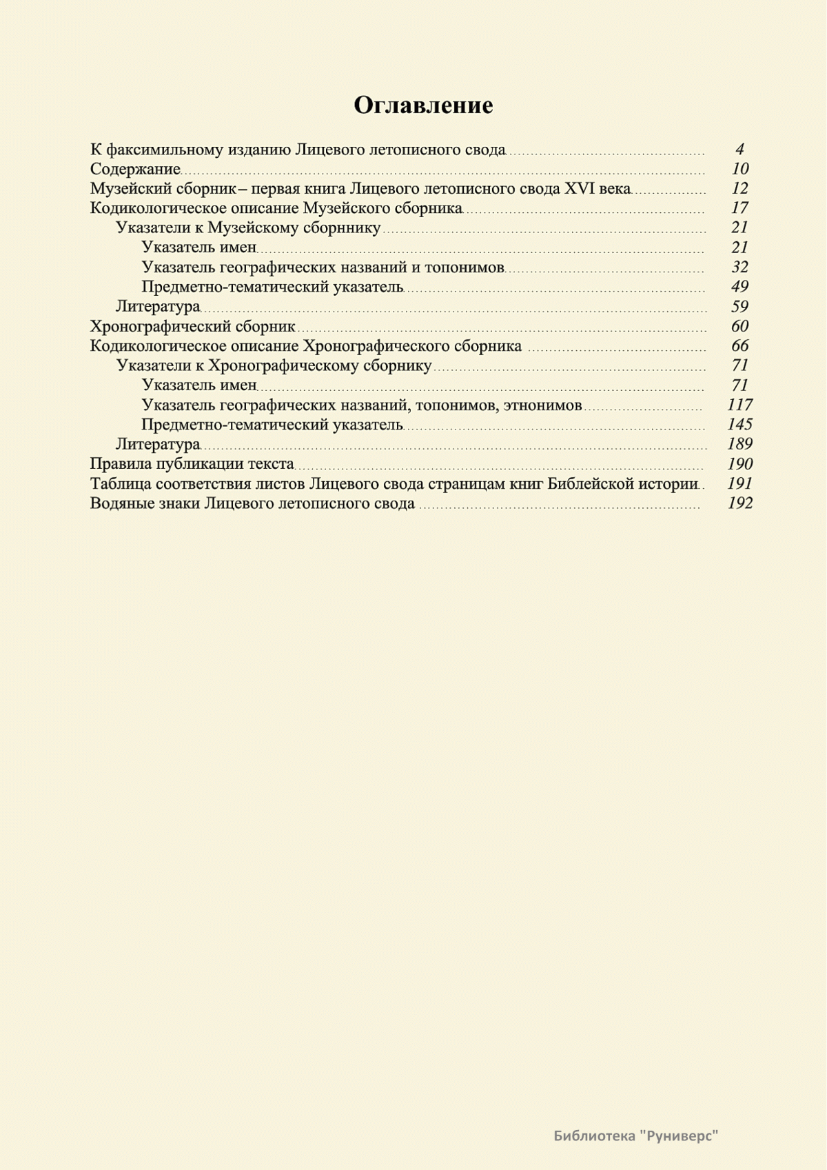 Лицевой летописный свод. XVI века — монументальный памятник древнерусского книжного искусства. На 10 тысячах листов с более чем 17 тысячами красочных миниатюр — «окон в историю» — представлена самая ранняя историческая и литературная энциклопедия. Лицевой свод дошел до наших дней в 10 томах, находящихся в разных древлехранилищах: БАН к РНБ в Санкт-Петербурге и ГИМ в Москве. Фирма «АКТЕОН» совместно с хранителями впервые осуществила научное факсимильное издание «Лицевой летописный свод XVI века». Предлагаемое издание с переводом — как дополнение в рамках научного аппарата вышеназванного факсимиле - представлено тремя разделами: библейская история, всемирная история, русская летописная история. В настоящем издании листы расположены в хронологическом порядке повествования На внешнем поле размещены транслитерация и перевод на современный русский язык. Русская летописная история 1114—1567 гг. — отражена на 6010 Лицевого летописного свода XVI века в следующих его томах: Г — Голицынский том (Отдел рукописей Российский национальной библиотеки, F.IV.225), Л — Лаптевский TOM (Отдел рукописей Российской национальной библиотеки, F.IV.233), O-I — Остермановский первый том (Отдел рукописей Библиотеки Академии наук, 31. 7. 30-1), O-II — Остермановский второй той (Отдел рукописей Библиотеки Академии наук, 31, 7. 30-2), Ш — Шумиловский том (Отдел рукописей Российской национальной библиотеки, F, IY. 232), С — Синодальный том (Отдел рукописей Государственного Исторического музея. Син. № 962), Ц— Царственная книга (Отдел рукописей Государственного Историческою музея. Син. № 149). В сносках отряжены разночтения с перепей ПСРЛ — Полным собранием русских летописей - фундаментальной для изучения истории древней и средневековой Руси книжной серией (её тексты, в основном, издавались наборно, в орфографии XIX века).