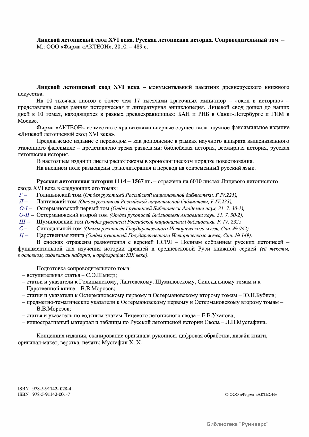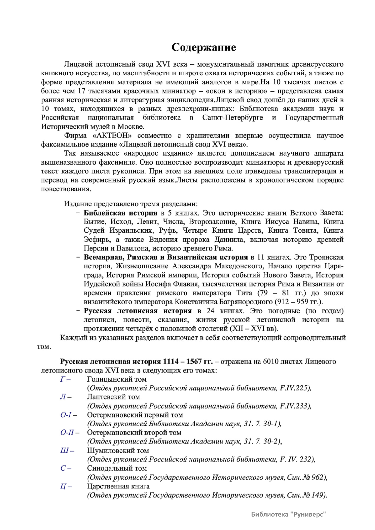 Лицевой летописный свод. XVI века — монументальный памятник древнерусского книжного искусства. На 10 тысячах листов с более чем 17 тысячами красочных миниатюр — «окон в историю» — представлена самая ранняя историческая и литературная энциклопедия. Лицевой свод дошел до наших дней в 10 томах, находящихся в разных древлехранилищах: БАН к РНБ в Санкт-Петербурге и ГИМ в Москве. Фирма «АКТЕОН» совместно с хранителями впервые осуществила научное факсимильное издание «Лицевой летописный свод XVI века». Предлагаемое издание с переводом — как дополнение в рамках научного аппарата вышеназванного факсимиле - представлено тремя разделами: библейская история, всемирная история, русская летописная история. В настоящем издании листы расположены в хронологическом порядке повествования На внешнем поле размещены транслитерация и перевод на современный русский язык. Русская летописная история 1114—1567 гг. — отражена на 6010 Лицевого летописного свода XVI века в следующих его томах: Г — Голицынский том (Отдел рукописей Российский национальной библиотеки, F.IV.225), Л — Лаптевский TOM (Отдел рукописей Российской национальной библиотеки, F.IV.233), O-I — Остермановский первый том (Отдел рукописей Библиотеки Академии наук, 31. 7. 30-1), O-II — Остермановский второй той (Отдел рукописей Библиотеки Академии наук, 31, 7. 30-2), Ш — Шумиловский том (Отдел рукописей Российской национальной библиотеки, F, IY. 232), С — Синодальный том (Отдел рукописей Государственного Исторического музея. Син. № 962), Ц— Царственная книга (Отдел рукописей Государственного Историческою музея. Син. № 149). В сносках отряжены разночтения с перепей ПСРЛ — Полным собранием русских летописей - фундаментальной для изучения истории древней и средневековой Руси книжной серией (её тексты, в основном, издавались наборно, в орфографии XIX века).