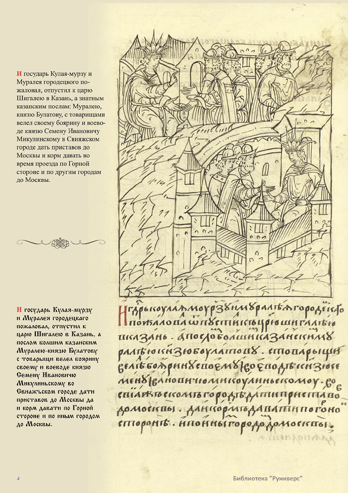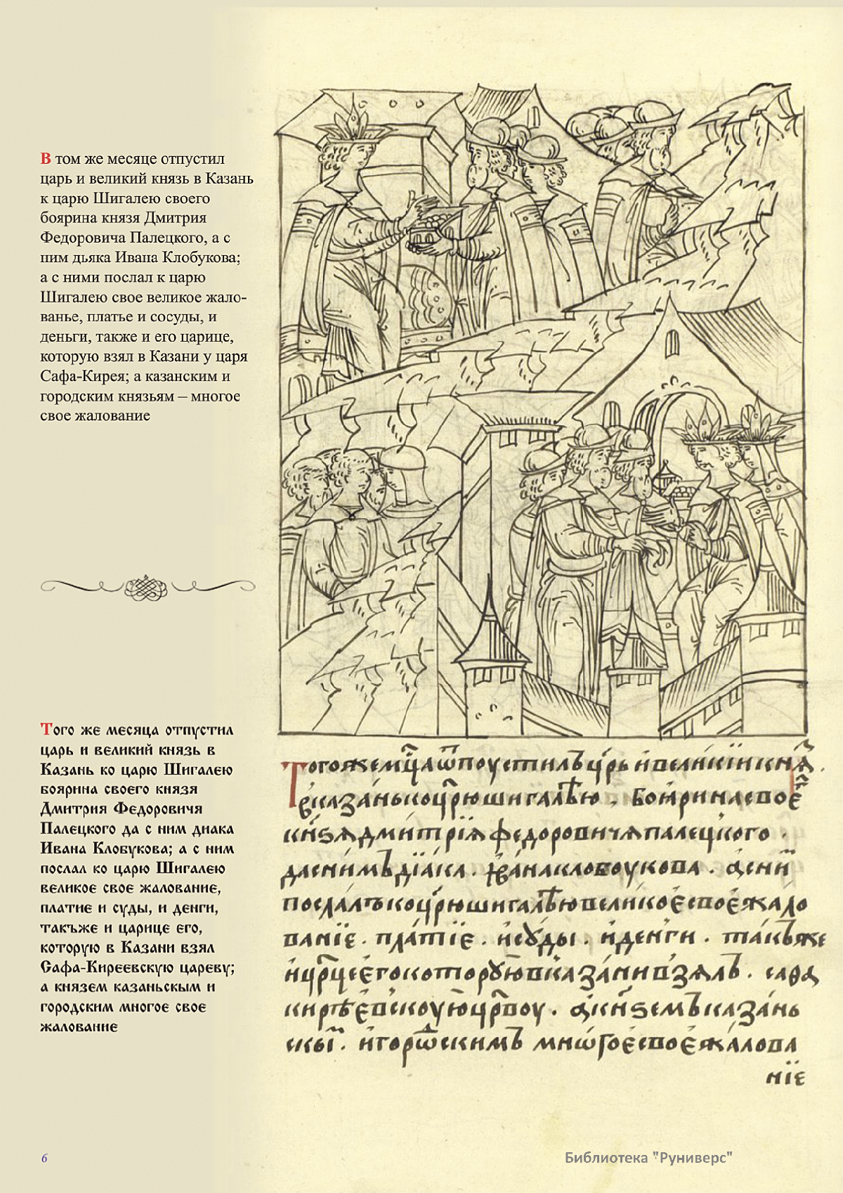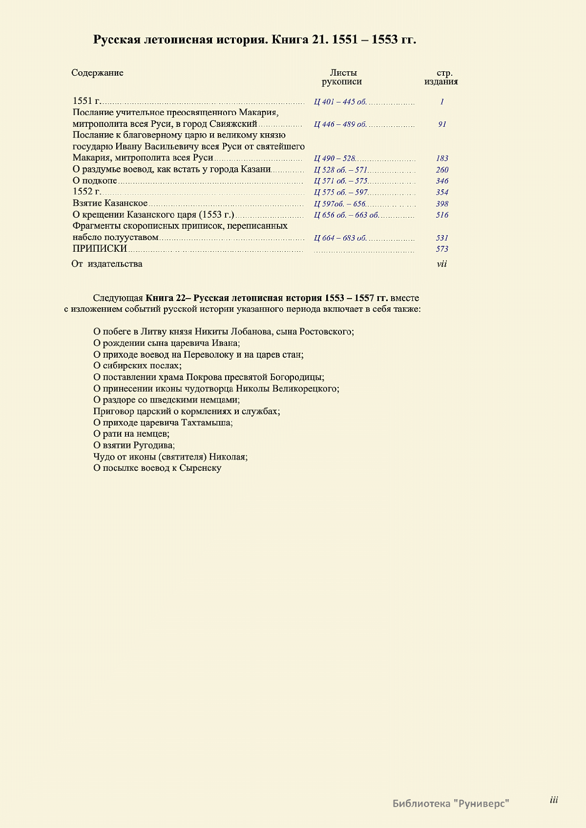 Лицевой летописный свод. XVI века — монументальный памятник древнерусского книжного искусства. На 10 тысячах листов с более чем 17 тысячами красочных миниатюр — «окон в историю» — представлена самая ранняя историческая и литературная энциклопедия. Лицевой свод дошел до наших дней в 10 томах, находящихся в разных древлехранилищах: БАН к РНБ в Санкт-Петербурге и ГИМ в Москве. Фирма «АКТЕОН» совместно с хранителями впервые осуществила научное факсимильное издание «Лицевой летописный свод XVI века». Предлагаемое издание с переводом — как дополнение в рамках научного аппарата вышеназванного факсимиле - представлено тремя разделами: библейская история, всемирная история, русская летописная история. В настоящем издании листы расположены в хронологическом порядке повествования На внешнем поле размещены транслитерация и перевод на современный русский язык. Русская летописная история 1114—1567 гг. — отражена на 6010 Лицевого летописного свода XVI века в следующих его томах: Г — Голицынский том (Отдел рукописей Российский национальной библиотеки, F.IV.225), Л — Лаптевский TOM (Отдел рукописей Российской национальной библиотеки, F.IV.233), O-I — Остермановский первый том (Отдел рукописей Библиотеки Академии наук, 31. 7. 30-1), O-II — Остермановский второй той (Отдел рукописей Библиотеки Академии наук, 31, 7. 30-2), Ш — Шумиловский том (Отдел рукописей Российской национальной библиотеки, F, IY. 232), С — Синодальный том (Отдел рукописей Государственного Исторического музея. Син. № 962), Ц— Царственная книга (Отдел рукописей Государственного Историческою музея. Син. № 149). В сносках отряжены разночтения с перепей ПСРЛ — Полным собранием русских летописей - фундаментальной для изучения истории древней и средневековой Руси книжной серией (её тексты, в основном, издавались наборно, в орфографии XIX века).