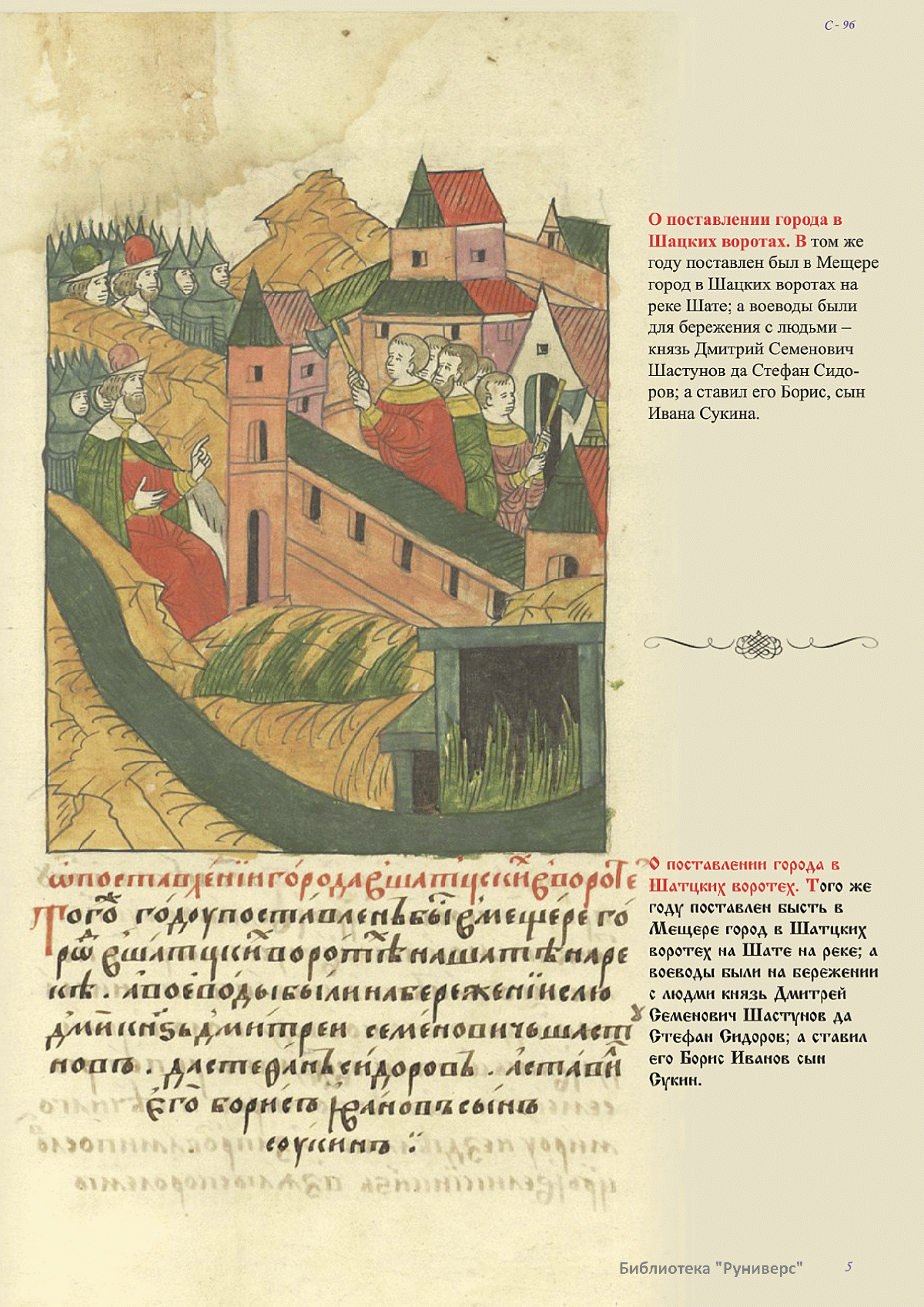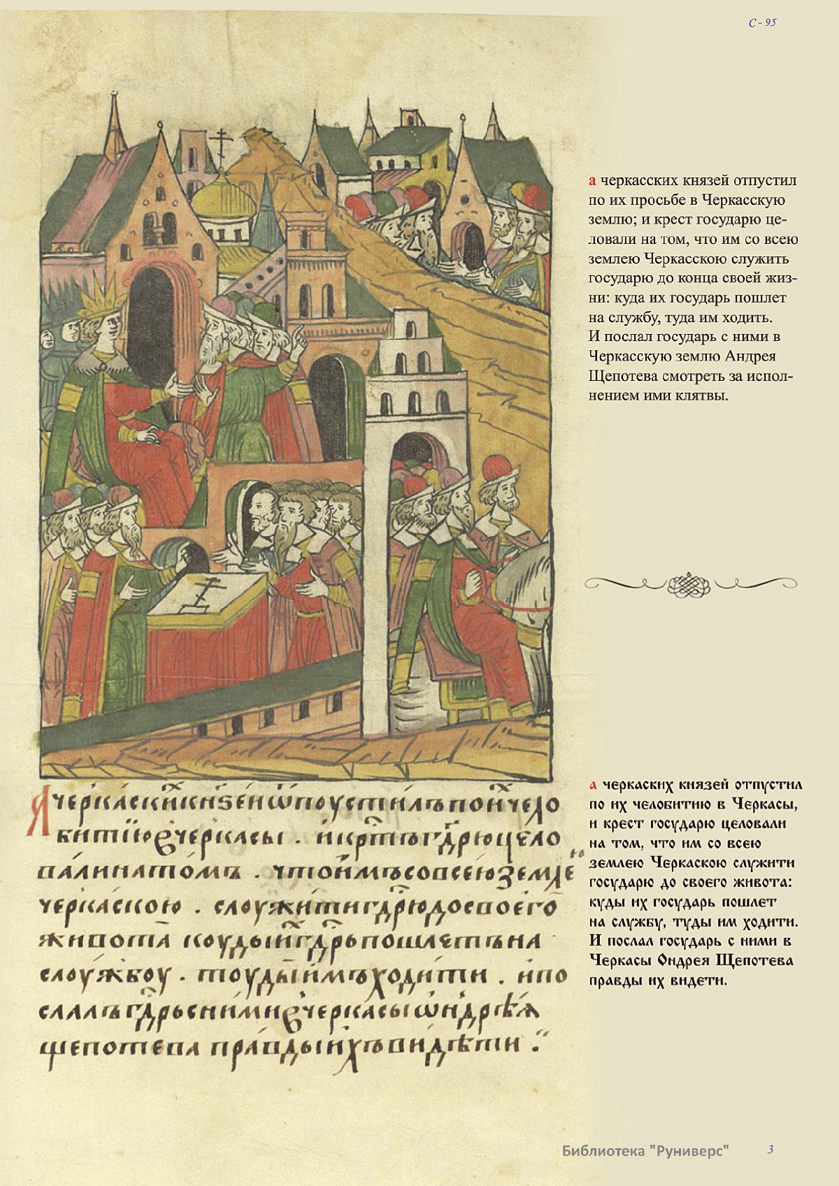 Лицевой летописный свод. XVI века — монументальный памятник древнерусского книжного искусства. На 10 тысячах листов с более чем 17 тысячами красочных миниатюр — «окон в историю» — представлена самая ранняя историческая и литературная энциклопедия. Лицевой свод дошел до наших дней в 10 томах, находящихся в разных древлехранилищах: БАН к РНБ в Санкт-Петербурге и ГИМ в Москве. Фирма «АКТЕОН» совместно с хранителями впервые осуществила научное факсимильное издание «Лицевой летописный свод XVI века». Предлагаемое издание с переводом — как дополнение в рамках научного аппарата вышеназванного факсимиле - представлено тремя разделами: библейская история, всемирная история, русская летописная история. В настоящем издании листы расположены в хронологическом порядке повествования На внешнем поле размещены транслитерация и перевод на современный русский язык. Русская летописная история 1114—1567 гг. — отражена на 6010 Лицевого летописного свода XVI века в следующих его томах: Г — Голицынский том (Отдел рукописей Российский национальной библиотеки, F.IV.225), Л — Лаптевский TOM (Отдел рукописей Российской национальной библиотеки, F.IV.233), O-I — Остермановский первый том (Отдел рукописей Библиотеки Академии наук, 31. 7. 30-1), O-II — Остермановский второй той (Отдел рукописей Библиотеки Академии наук, 31, 7. 30-2), Ш — Шумиловский том (Отдел рукописей Российской национальной библиотеки, F, IY. 232), С — Синодальный том (Отдел рукописей Государственного Исторического музея. Син. № 962), Ц— Царственная книга (Отдел рукописей Государственного Историческою музея. Син. № 149). В сносках отряжены разночтения с перепей ПСРЛ — Полным собранием русских летописей - фундаментальной для изучения истории древней и средневековой Руси книжной серией (её тексты, в основном, издавались наборно, в орфографии XIX века).