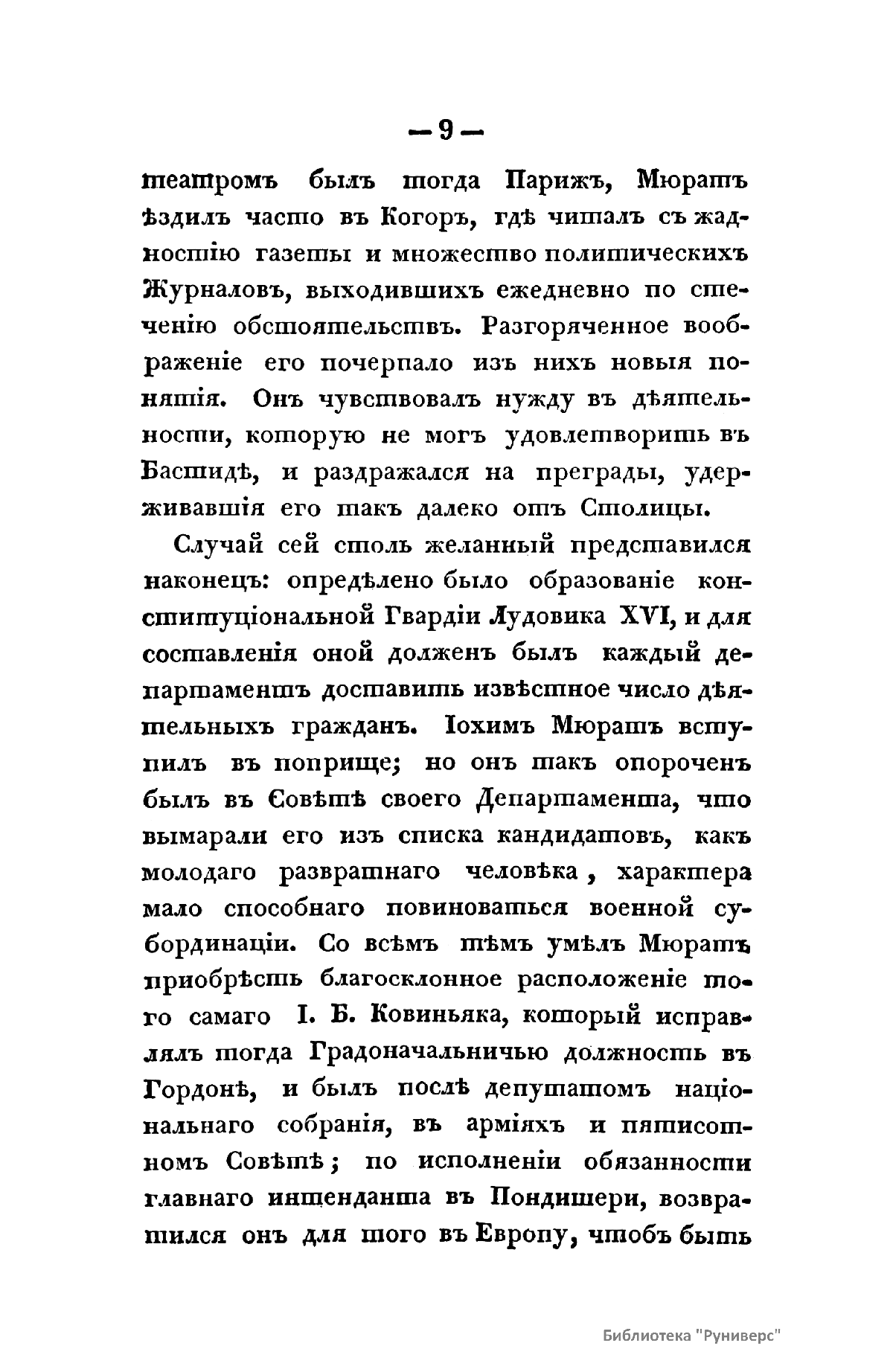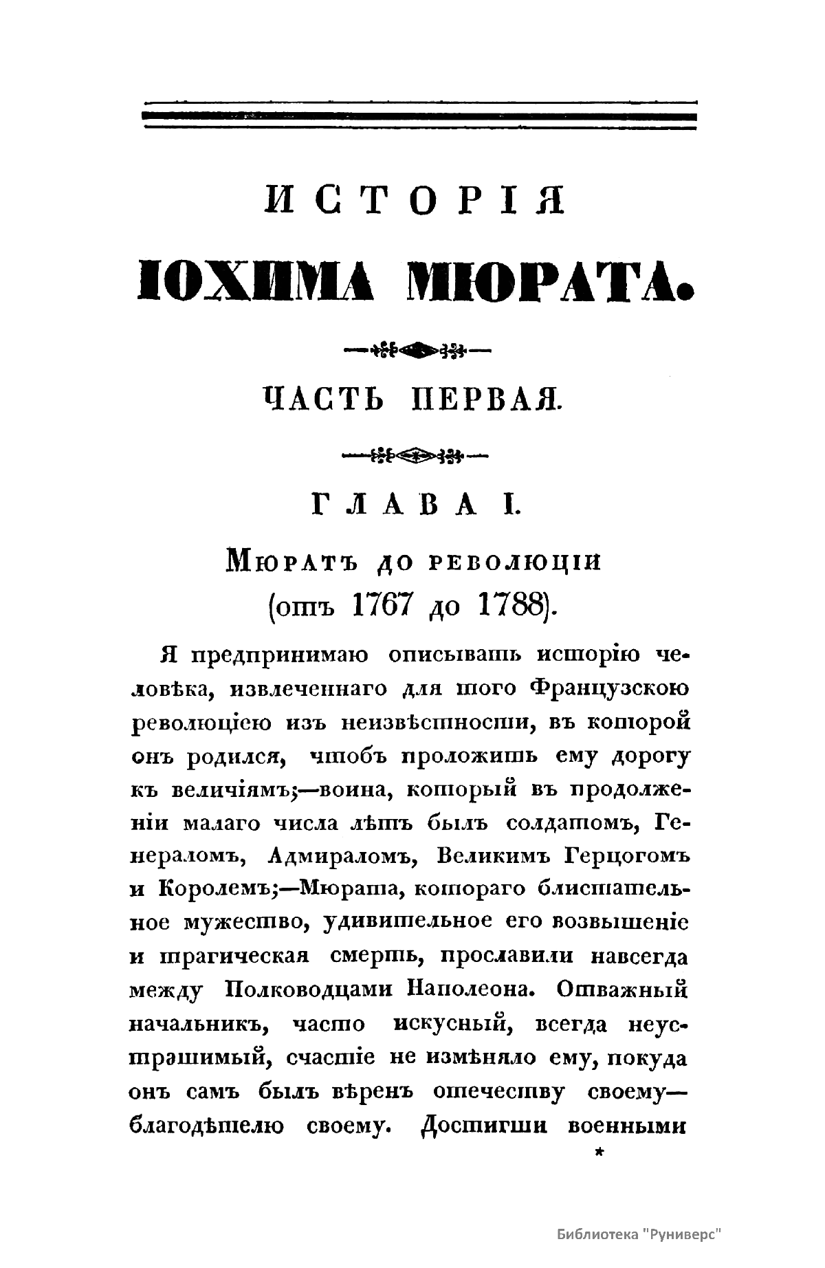 «История Иохима Мюрата, зятя Наполеонова, бывшаго короля Неаполитанскаго» Л.-Ш. Галлуа вышла в свет в России в 1830 г., через почти двадцать лет после событий Отечественной войны 1812 г. Автор книги был установлен по парижскому изданию 1828 г. Современник Мюрата, Галлуа собрал и обработал интересный материал, касающийся как непосредственно биографии знаменитого маршала, так и наполеоновской эпохи в целом. Сын трактирщика, ученик духовной семинарии, Иоахим Мюрат сделал блестящую карьеру военного и политического деятеля. Получил звание маршала Франции, корону Неаполитанского королевства, титул герцога Бергского, Великого адмирала, принца империи. Был женат на сестре Бонапарта Каролине. Мюрат принимал участие практически во всех военных кампаниях и крупных сражениях наполеоновских войн, проявив себя талантливым военачальником. Во время войны с Россией был назначен командующим кавалерией французской армии, лично водил в атаку кирасиров на укрепления русских войск в Бородинской битве, в сражении при Тарутино Мюрату удалось спасти остатки французской армии и выйти из окружения противника.