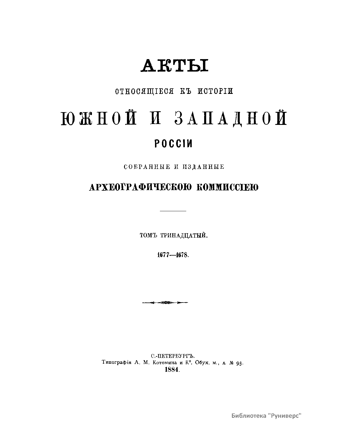 Акты, относящiеся къ исторiи южной и западной Россiи. Томъ тринадцатый. 1677-1678