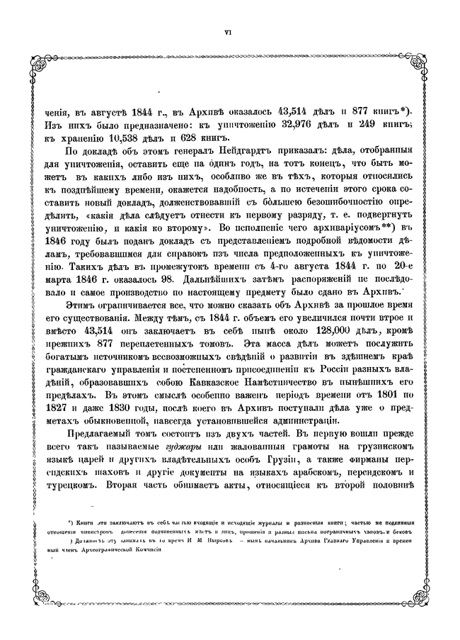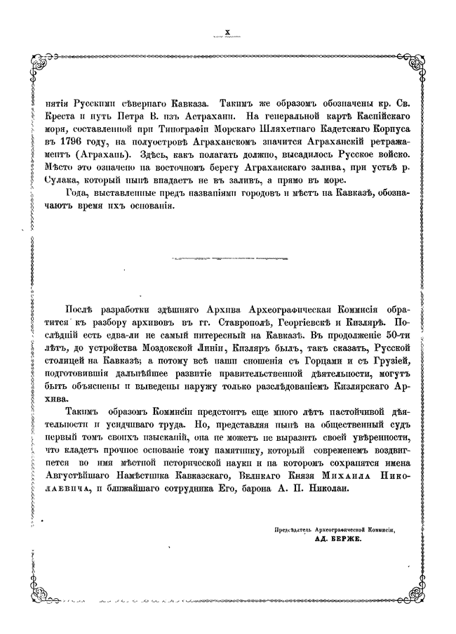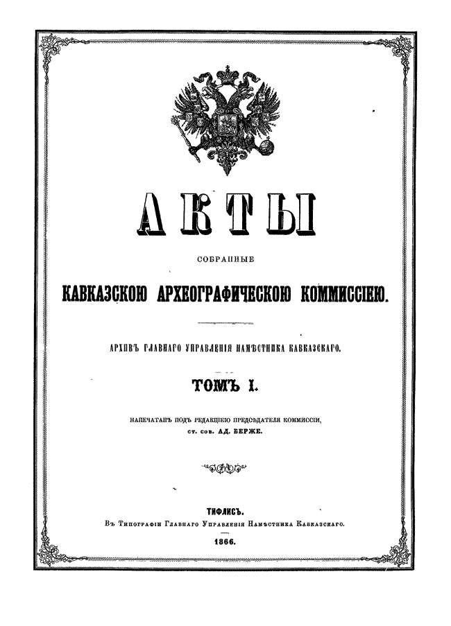 Документы по истории Кавказа с X века по 1862 год издавались по инициативе русских властей под редакцией председателя Кавказской археографической комиссии Адольфа Петровича Берже (1828 – 1886). В двенадцати томах издания опубликованы разнообразные сведения по истории народов Кавказа: арабская хроника, фирманы, гуджары (жалованные грамоты) и другие акты, главным образом XIV — первой половины XIX века на грузинском, армянском, русском, арабском, персидском, татарском, турецком языках с русским переводом, а также родословные местных ханов и султанов. Каждый том включает документы за время правления того или иного кавказского наместника.
