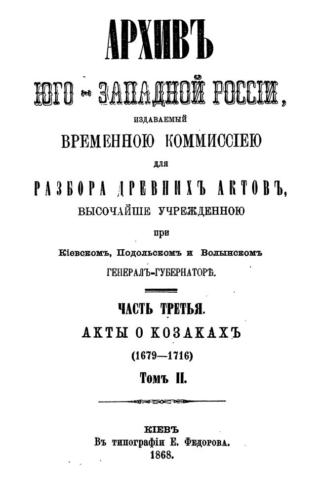 В серии «Архив Юго-Западной России» были напечатаны документы Киевского архива. Издание было предпринято Киевской археографической комиссией с 1859 по 1911 год. Всего вышло 34 тома.