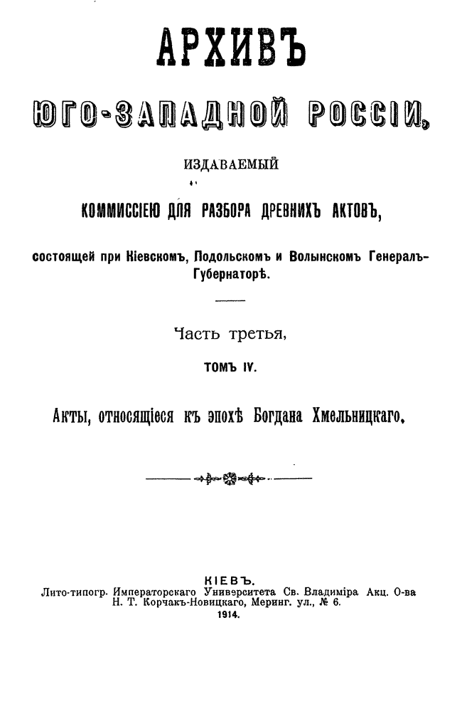 В серии «Архив Юго-Западной России» были напечатаны документы Киевского архива. Издание было предпринято Киевской археографической комиссией с 1859 по 1911 год. Всего вышло 34 тома.