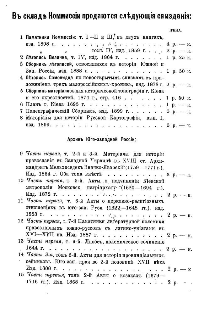 В серии «Архив Юго-Западной России» были напечатаны документы Киевского архива. Издание было предпринято Киевской археографической комиссией с 1859 по 1911 год. Всего вышло 34 тома.