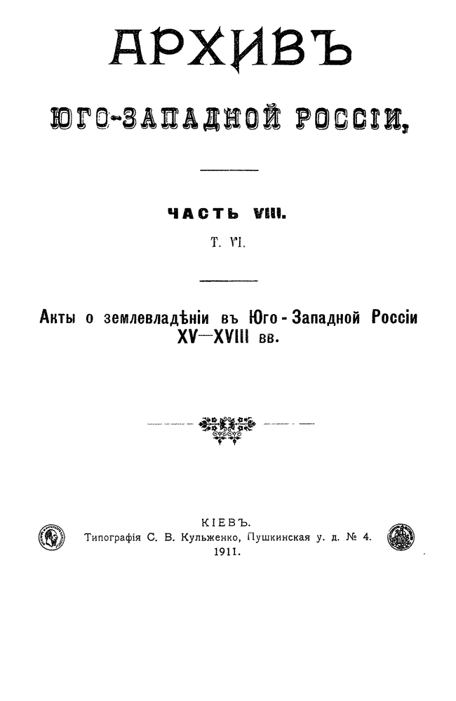 В серии «Архив Юго-Западной России» были напечатаны документы Киевского архива. Издание было предпринято Киевской археографической комиссией с 1859 по 1911 год. Всего вышло 34 тома.