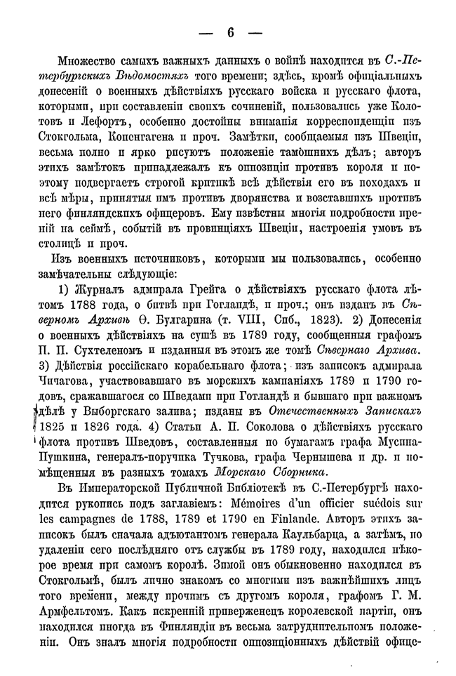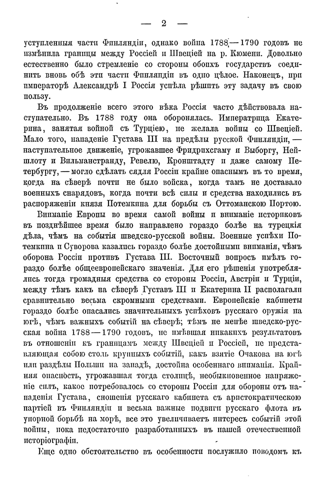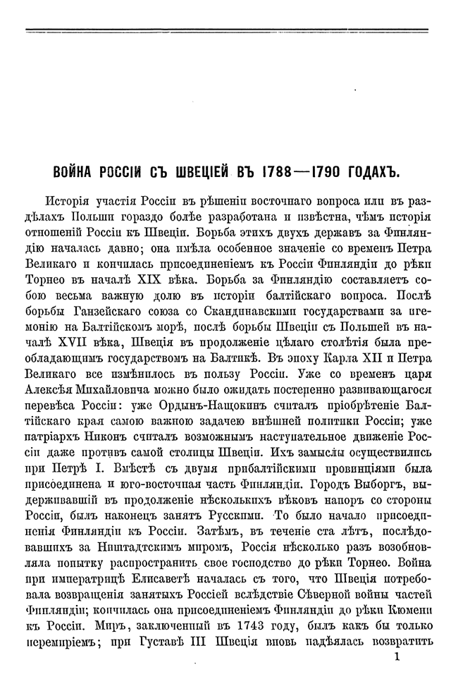 Швеция в продолжение всего XVII столетия была преобладающим государством на Балтике. В эпоху Карла XII и Петра I это положение изменилось в пользу России: вместе с двумя прибалтийскими провинциями была присоединена юго-восточная часть Финляндии. При Елизавете Финляндия была присоединена до реки Кюмени. Во время русско-шведской войны 1788 – 1790 годов при Густаве III шведы попытались вернуть уступленные части Финляндии. Но эта война не изменила границы. Во время своей работы над книгой автор пользовался и русскими, и шведскими историческими материалами.