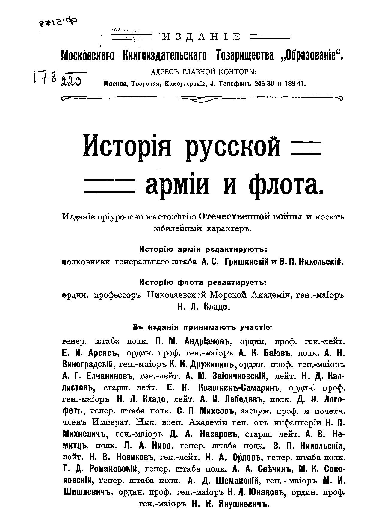 «История» рисует картину постепенного развития русского военного дела. С особым вниманием издание останавливается на наиболее выдающихся боевых эпизодах, интересуясь в тоже время организацией, бытом, вооружением и боевой подготовкой наших войск, в связи с политической жизнью государства. «История русской армии и флота» по своим размерам ( до 170 печатных листов) значительно превосходит прежние издания этого рода. Снабженная большим количеством иллюстраций и фотографий, она предназначалась для просвещения и русского офицерства, и русского общества.