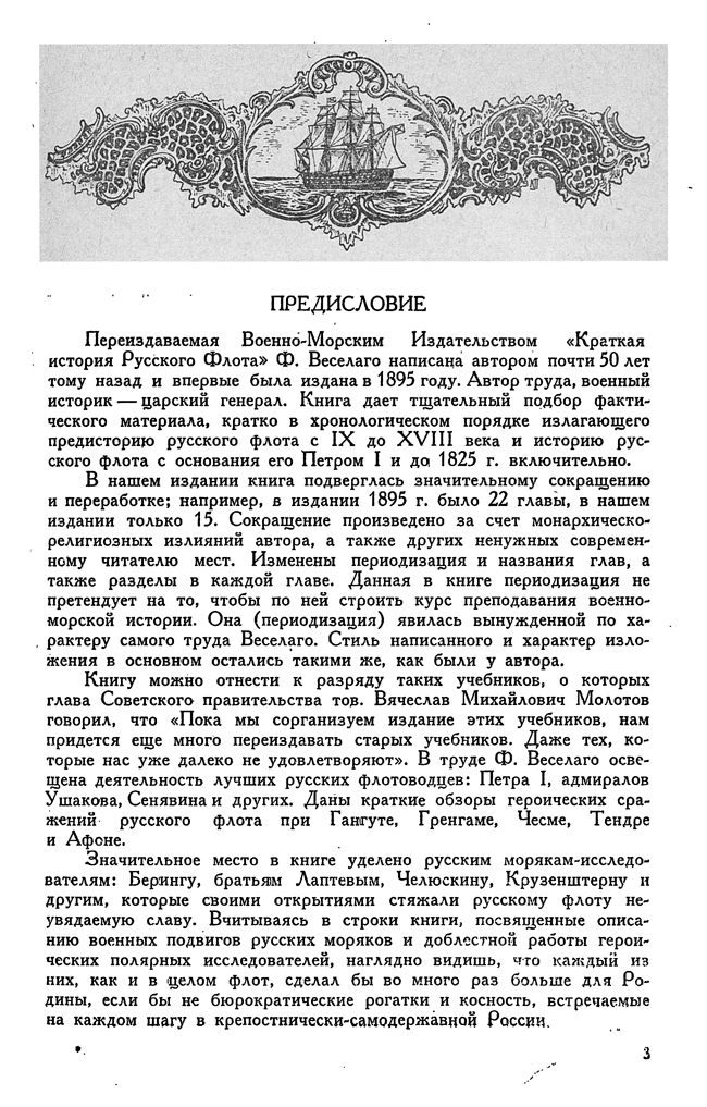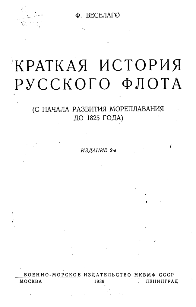 Переиздаваемая Военно-Морским Издательством «Краткая история Русского Флота» Ф. Веселаго написана автором почти 50 лет тому назад и впервые была издана в 1895 году. Автор труда, военный историк — царский генерал. Книга дает тщательный подбор фактического материала, кратко в хронологическом порядке излагающего предисторию русского флота с IX до XVIII века и историю русского флота с основания его Петром I и до 1825 года включительно. В советском издании книга подверглась значительному сокращению и переработке.