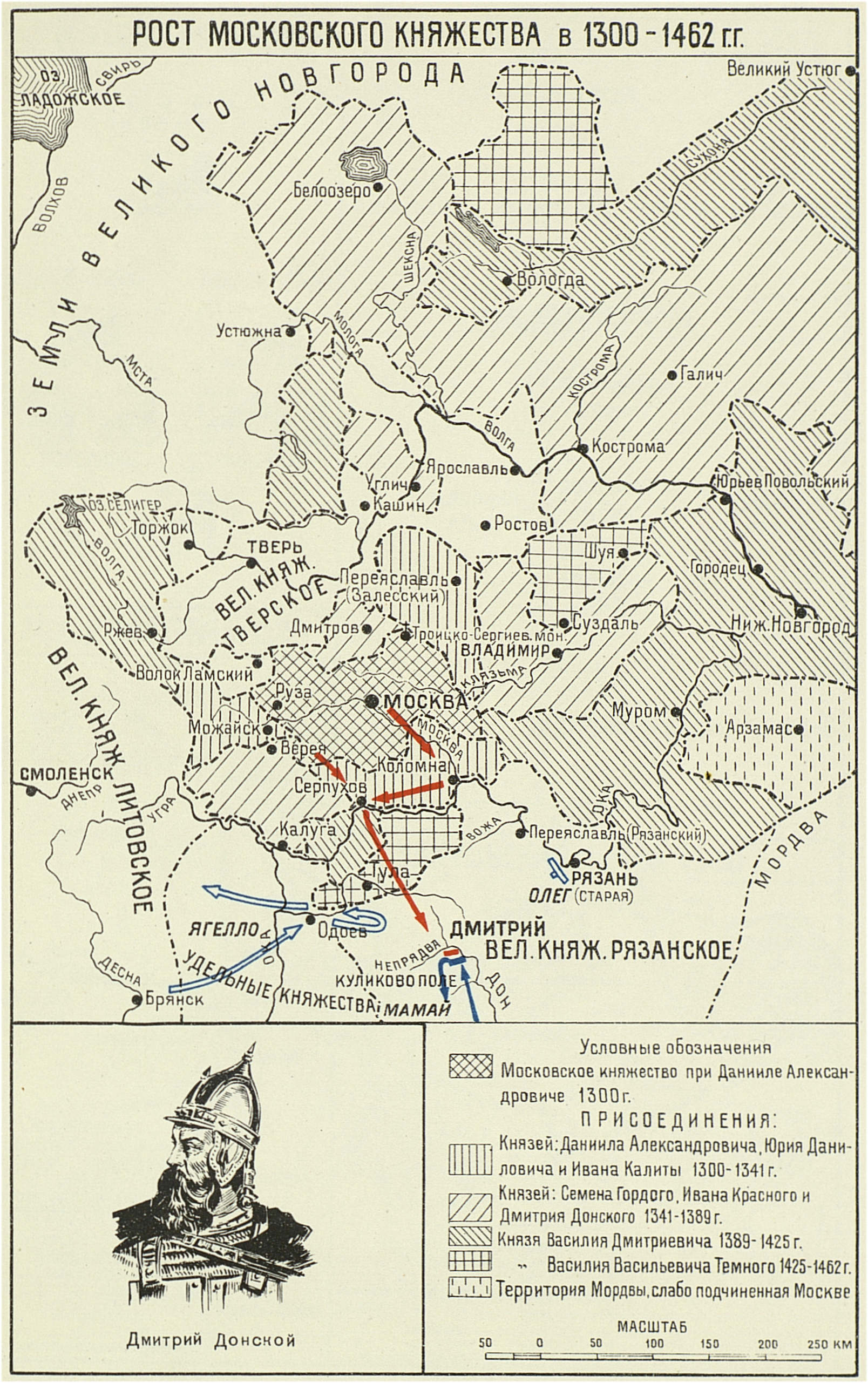 Опираясь на растущие материальные силы, моск. князья повели упорную борьбу за политич. главенство в рус. землях. Князь Юрий Данилович, опираясь на поддержку Новгорода Великого, а также используя золотоордынских ханов, в 1318 стал вел. князем владимирским, но с 1325 великое княжение было передано тверскому князю. Иван Данилович Калита участием в подавлении восстания в Твери в 1327 приобрел большое доверие хана и в 1328 стал вел. князем