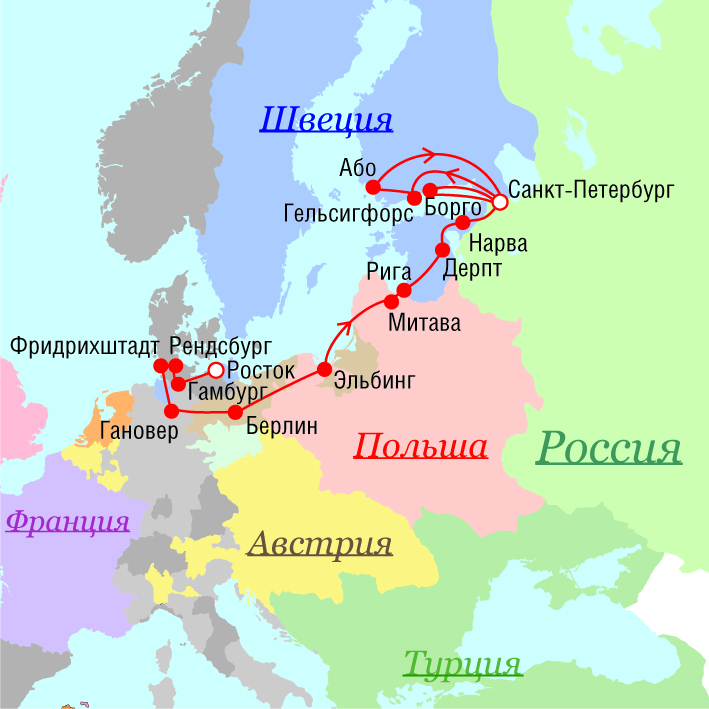 На карте указаны маршруты путешествий Петра I на каждый год. Расстояния приблизительно вычислены по российским дорожникам XVIII и XIX вв. Различия в длине маршрутов Петра и современного пути объясняются другой сеткой дорог. Длина маршрутов, на которые данные дорожников отсутствуют, была определена по электронным картам.