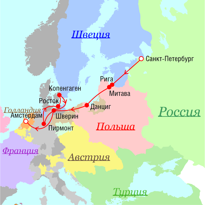 Маршрут поездок Петра I - 1716 г.