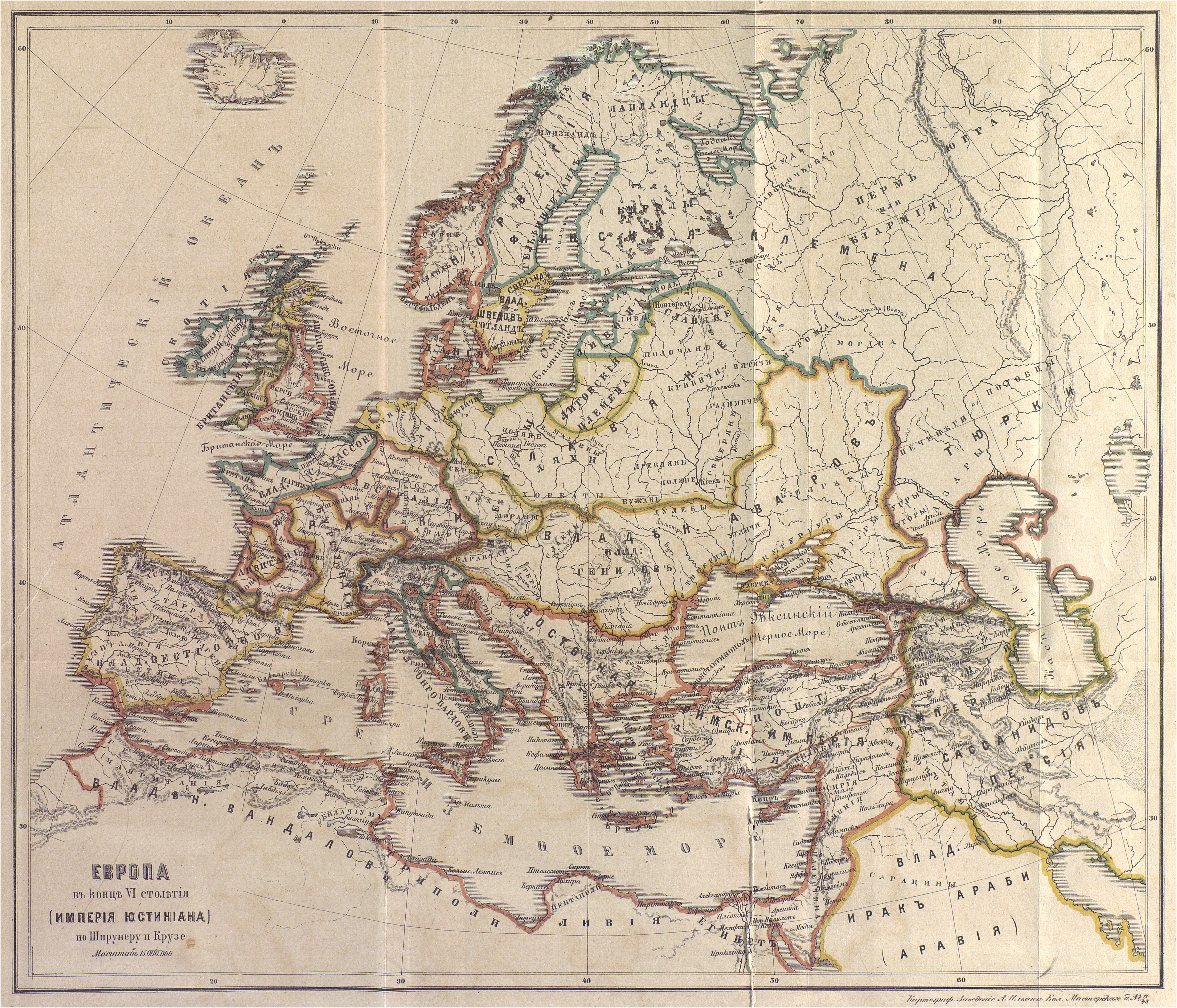 Европа в конце VI столетия (Империя Юстиниана) по Шпрунеру и Крузе