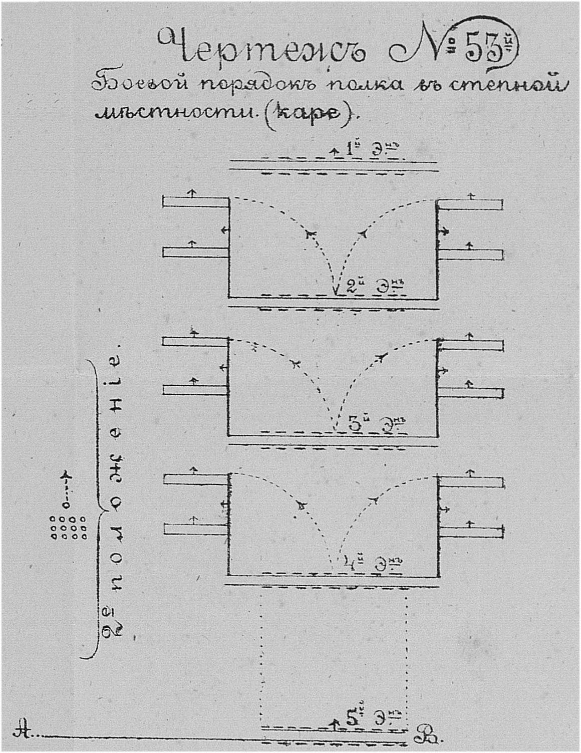 Чертежи различных строев и перестроений. Чертеж №53. Боевой порядок полка в степной местности (каре).