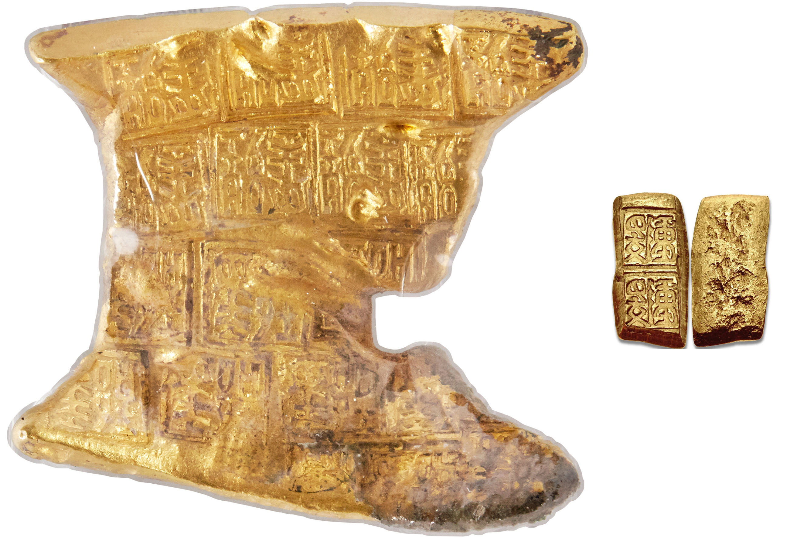 Слева: Период Вёсен и осеней (400-220 гг. до н.э.), золото царства Чу (Chǔ). Так называемые блочные или кубические деньги Yǐng Yuán. Крайне редкий экземпляр, при это сертифицированный аж как MS62+ грейдинговым агентством из Макао Gongbo ancient coins. 62x59 мм. 247,9 г. Разделен примерно на 18 квадратов, на каждом из которых отчеканено Yǐng Yuán (Ин - столица Чу, а Юань - единица веса). Одна из многих разнообразных форм монет, использовавшихся в бурный период Воюющих государств наряду с лопатами, ножами, круглыми монетами и подражанием ракушкам каури. Это самые ранние золотые деньги, которые были обнаружены в Китае и, скорее всего, ровесники лидийских статеров. Первые сведения о них встречаются в исторических текстах, датируемых 1050 г., но что это такое и как оно использовалось – не было выяснено до 1878 г. Не разрубленные блоки практически уникальны. Блок на 18 квадратов как здесь – уникален, до этого встречались только максимум на 15, и куда менее редкие на 6 (которые уходили, в среднем, за 25 тысяч долларов). Оценочная стоимость – от $80 тысяч, лот впоследствии был снят, но, думается, цена легко бы пробила и несколько сотен, если не полмиллиона. Справа для сравнения двойной слиток царства Чу, продан за $15.000.